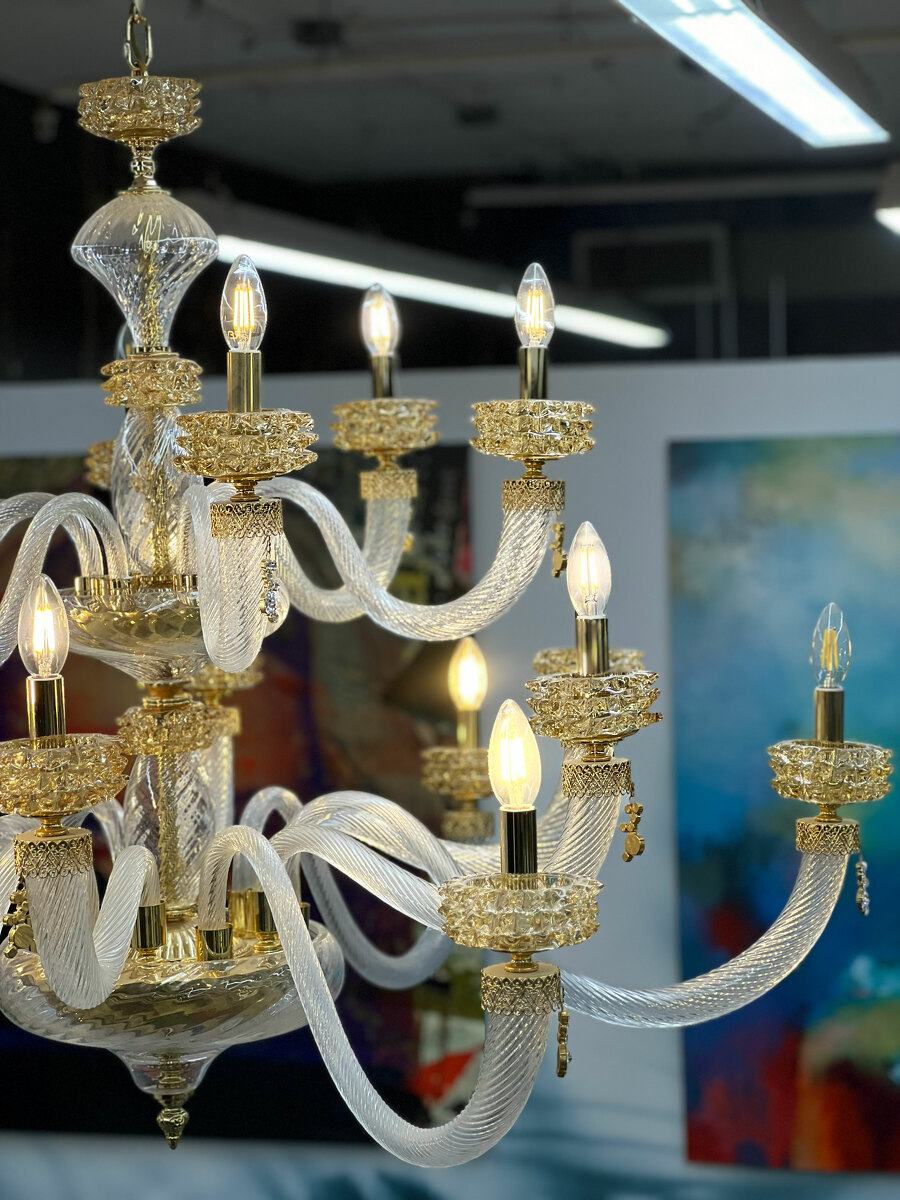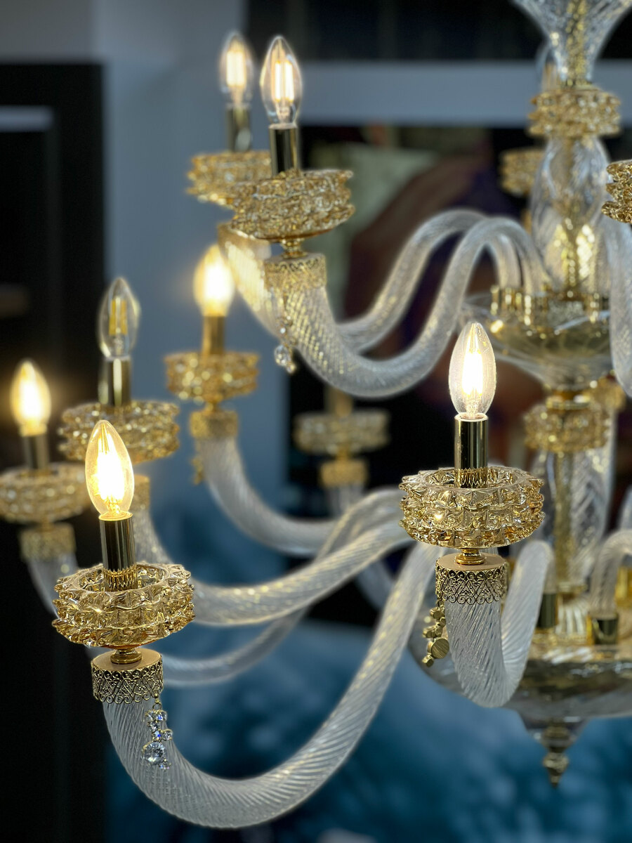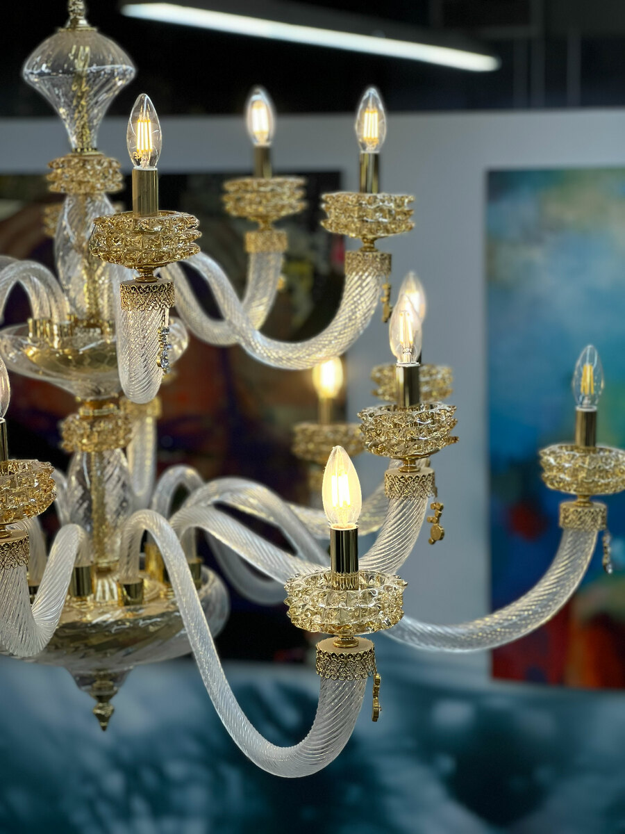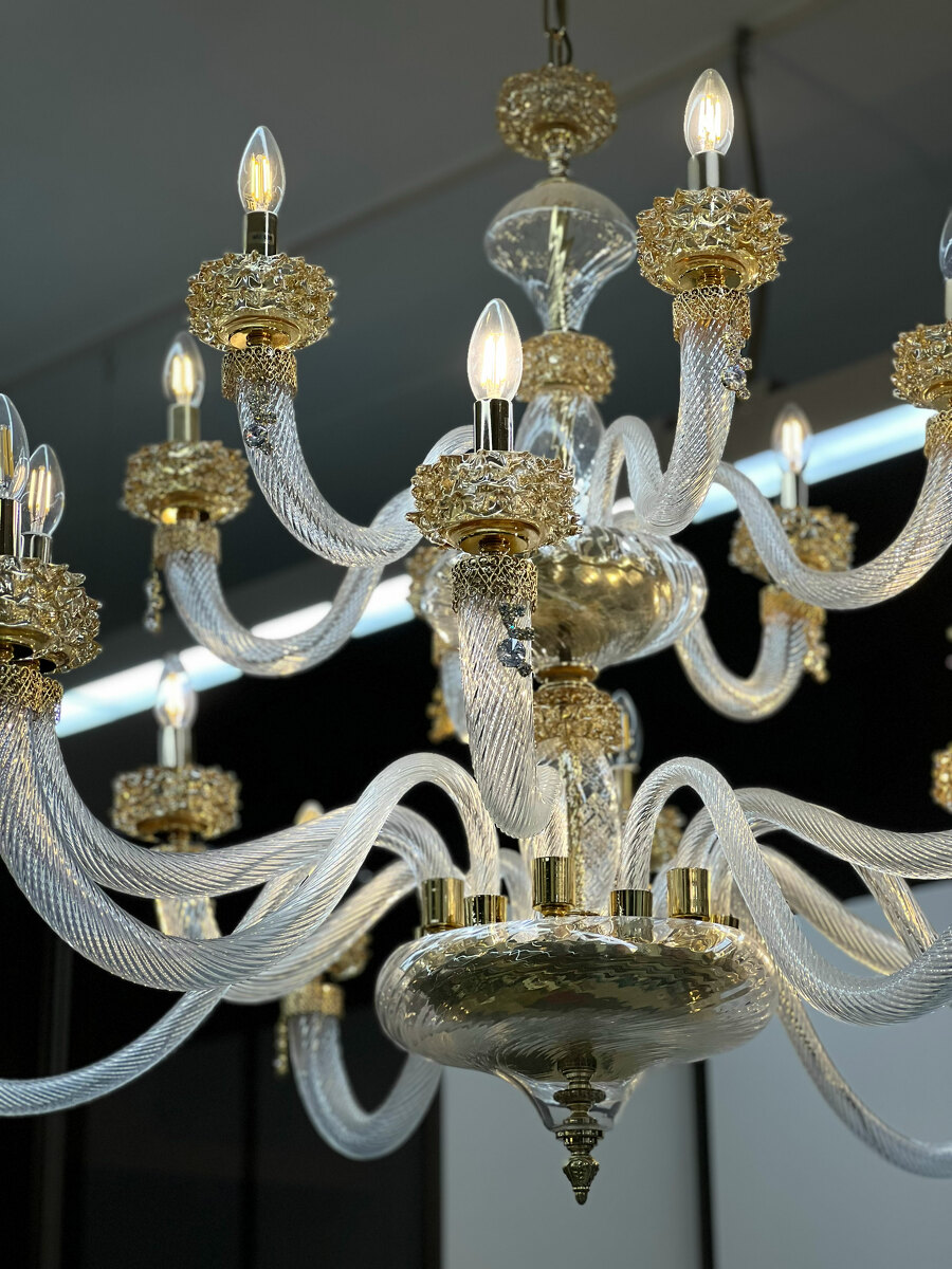 Шикарная двухъярусная люстра на 18 рожков из Муранского прозрачного стекла с элементами из стекла янтарного цвета.