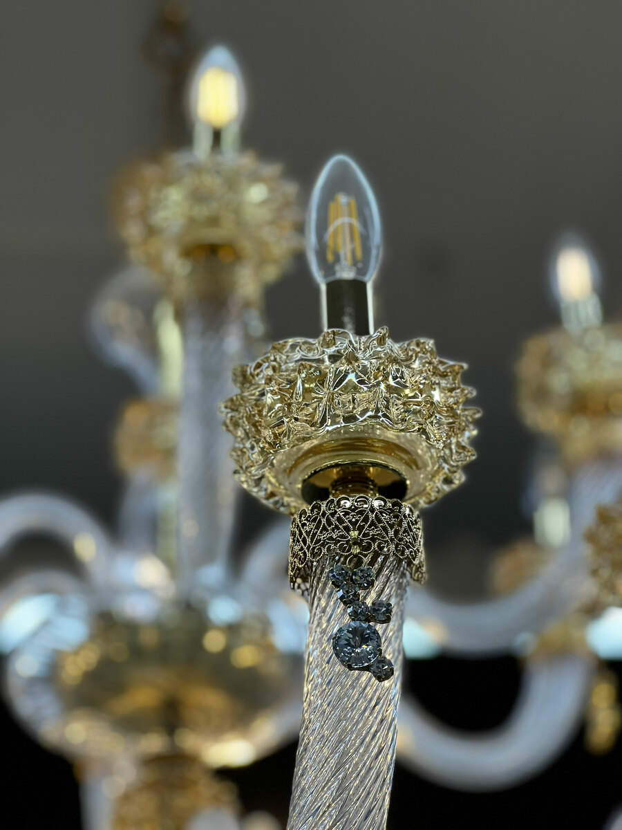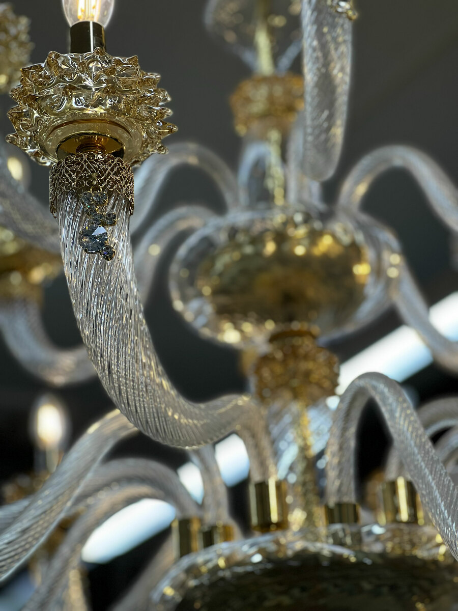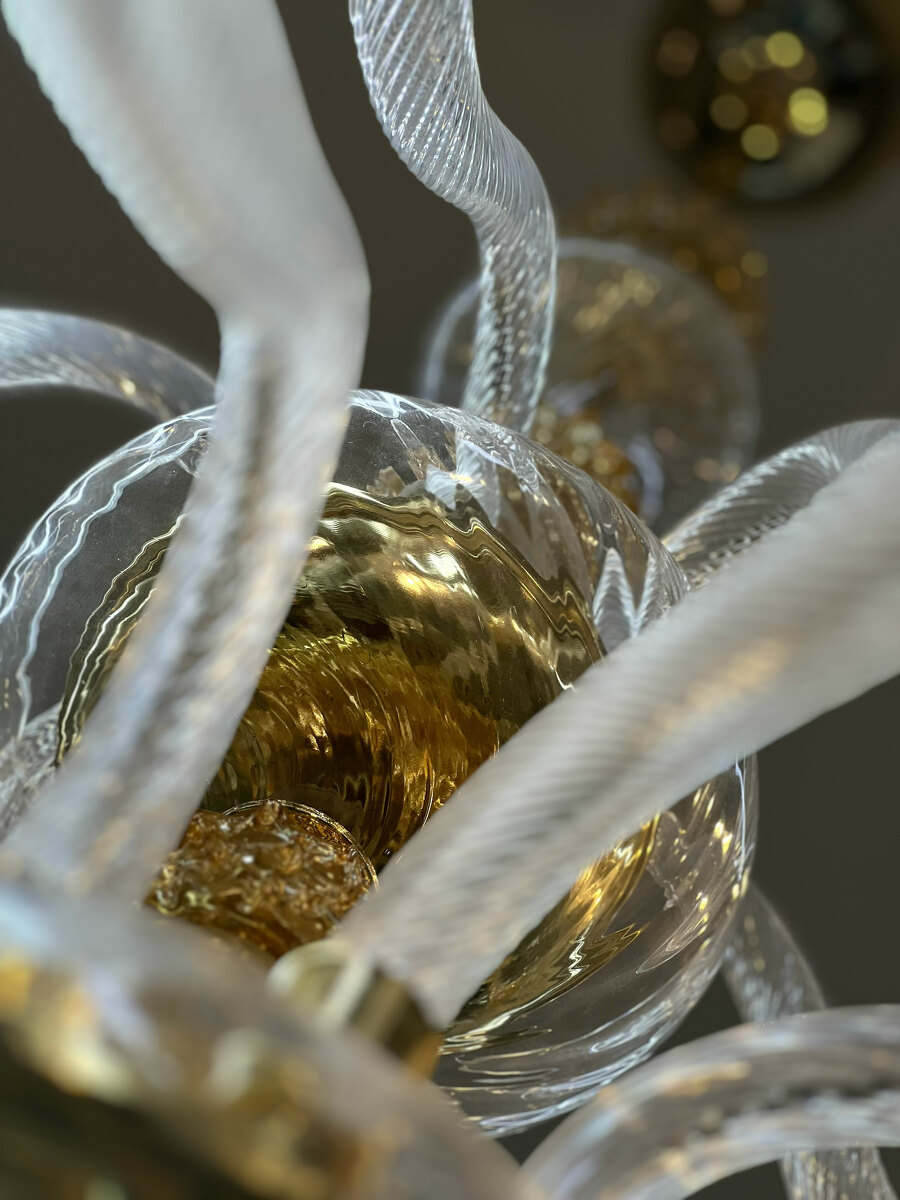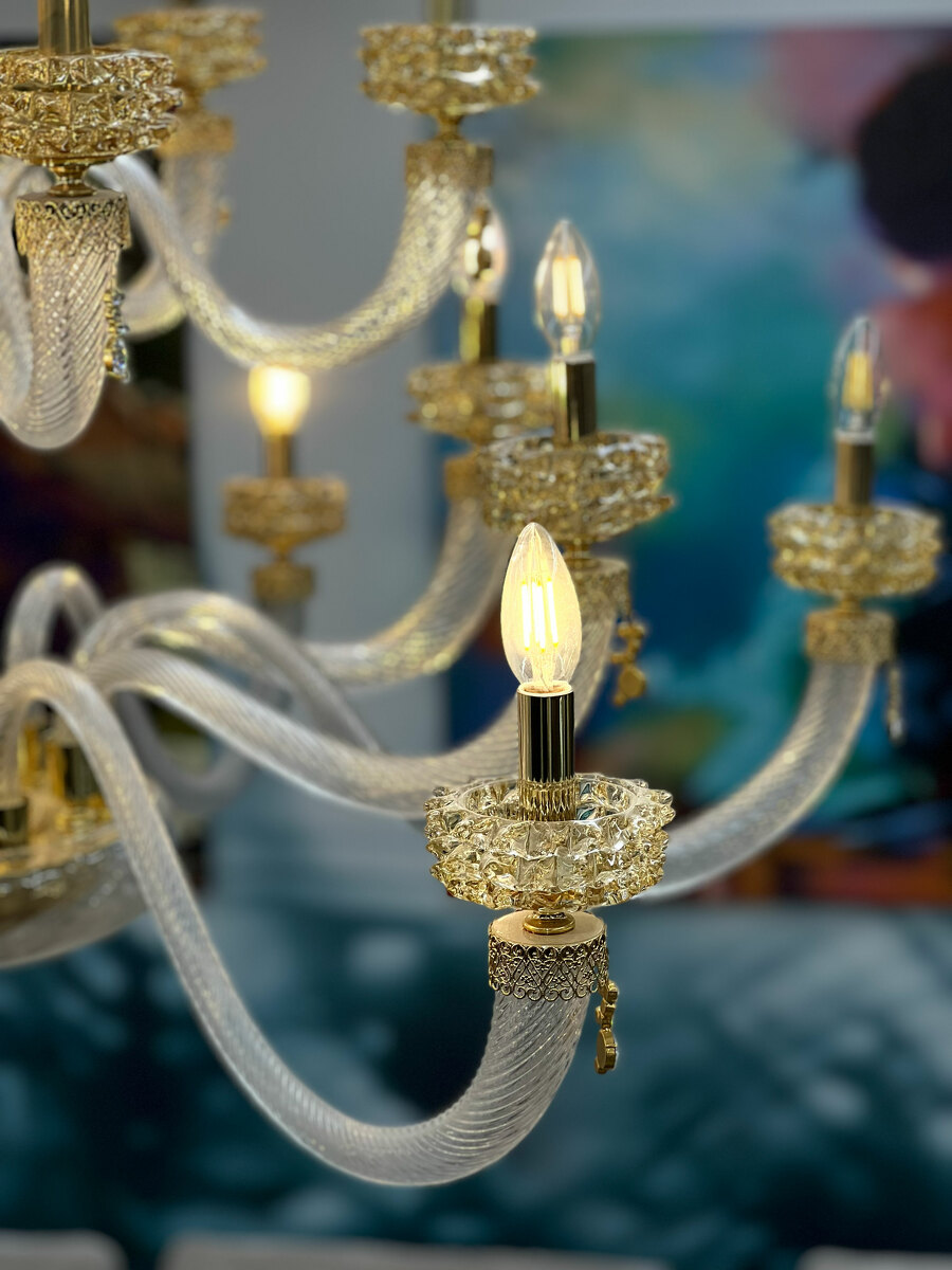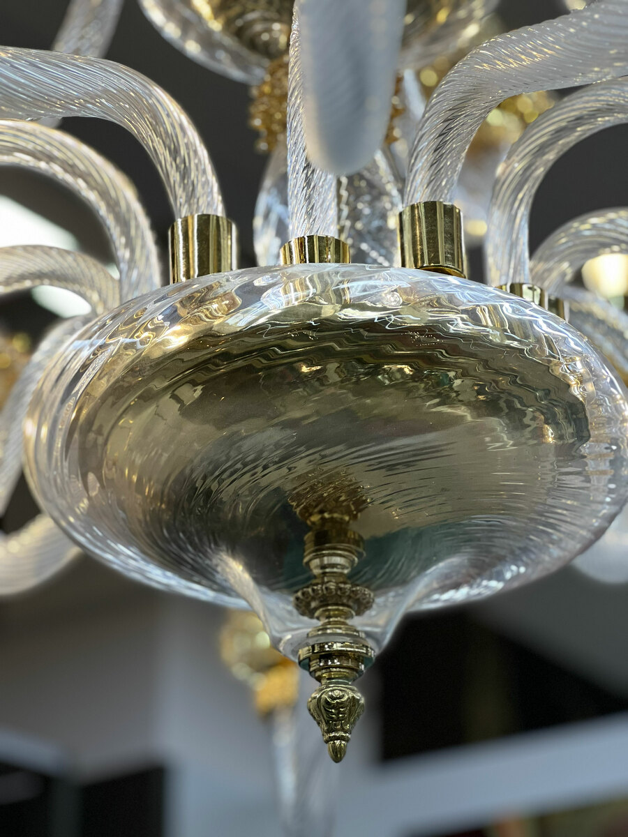 Шикарная двухъярусная люстра на 18 рожков из Муранского прозрачного стекла с элементами из стекла янтарного цвета.