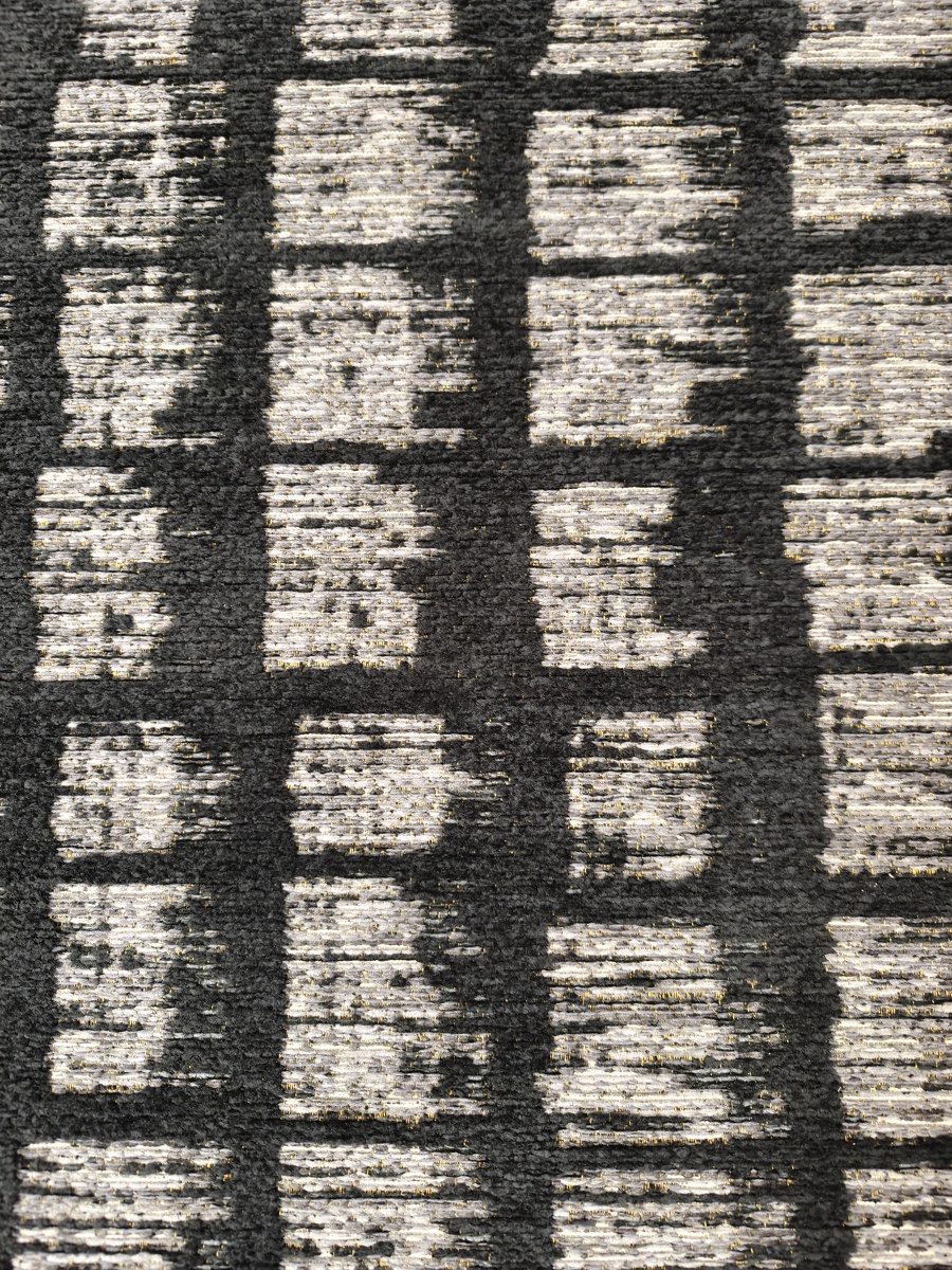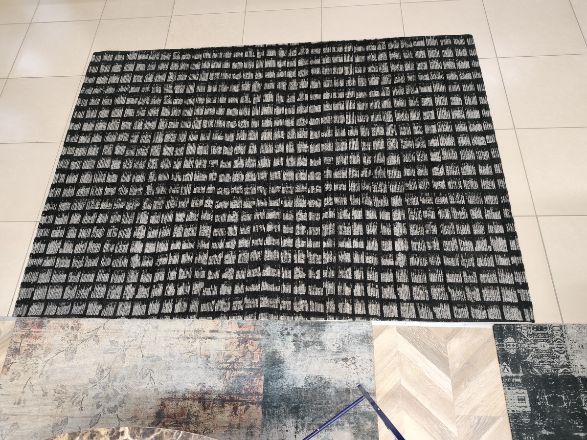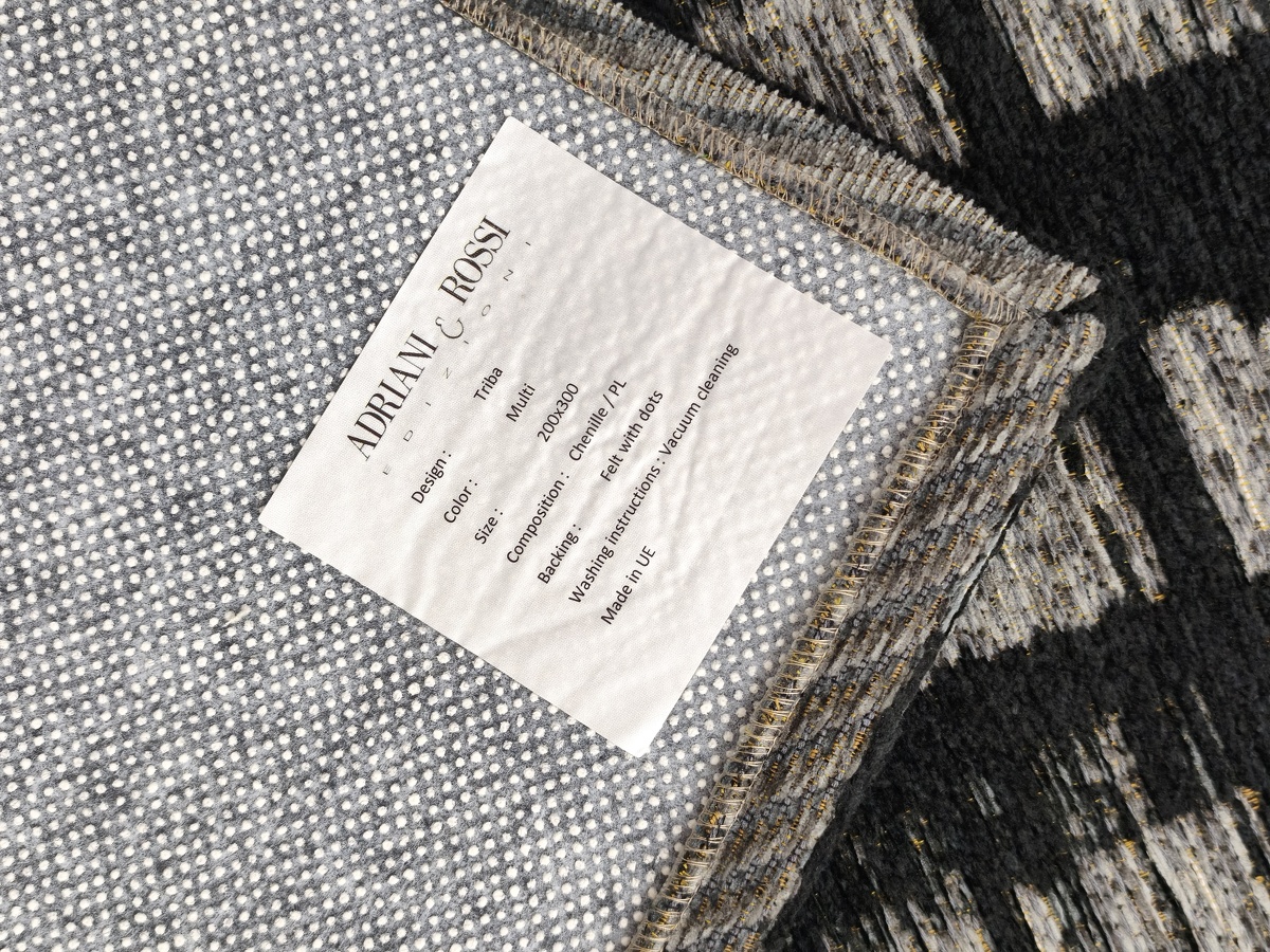 Ковер с этническим орнаментом, сочетающим три цвета: черный, серый и антрацит. Состав: хлопок, шенилл и полиамид.