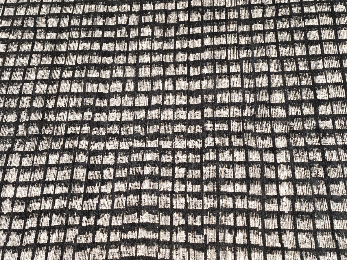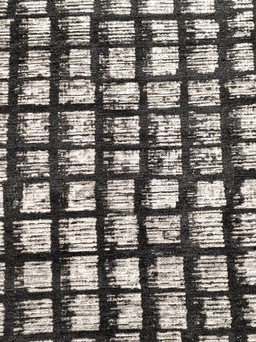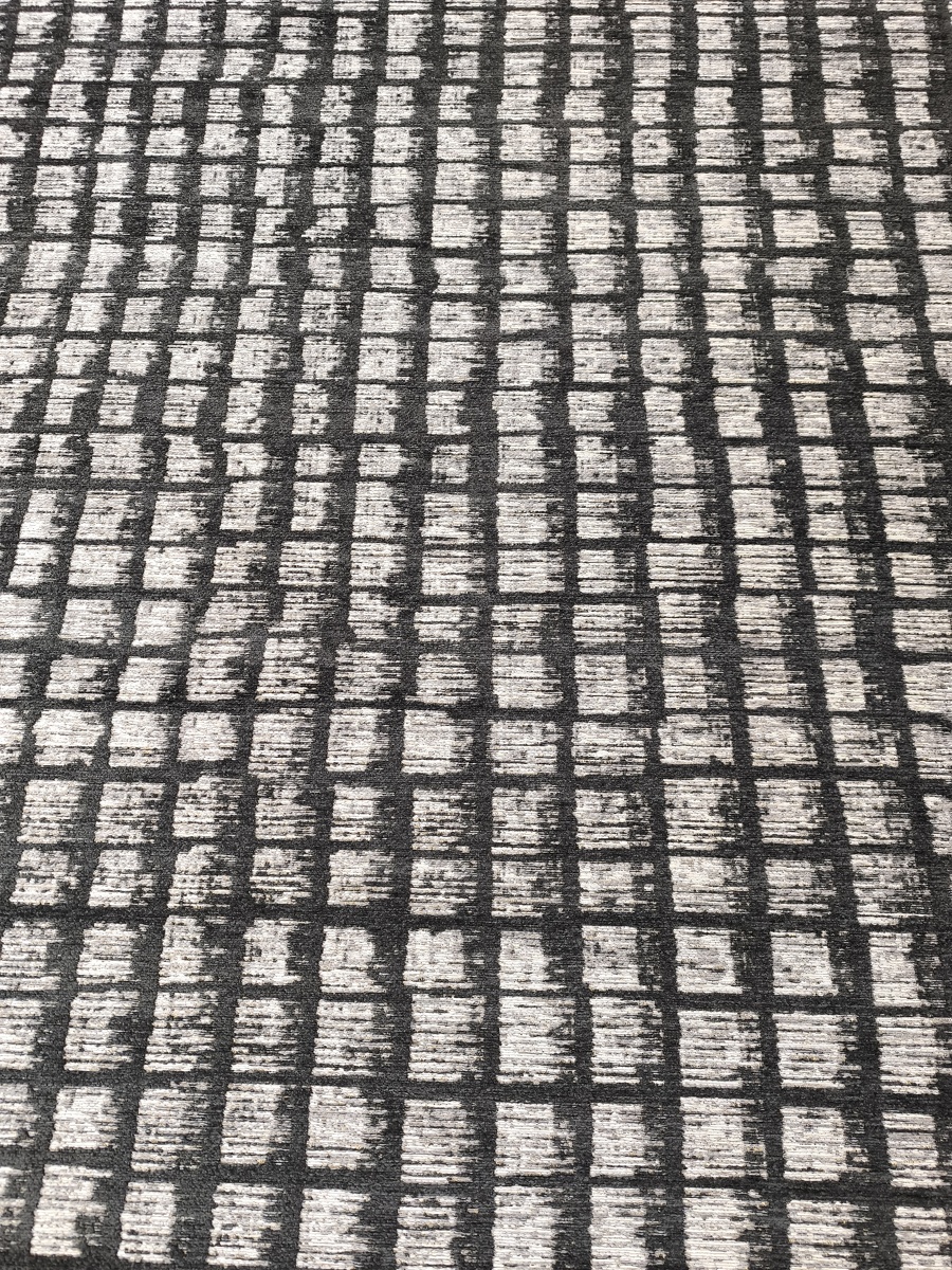 Ковер с этническим орнаментом, сочетающим три цвета: черный, серый и антрацит. Состав: хлопок, шенилл и полиамид.