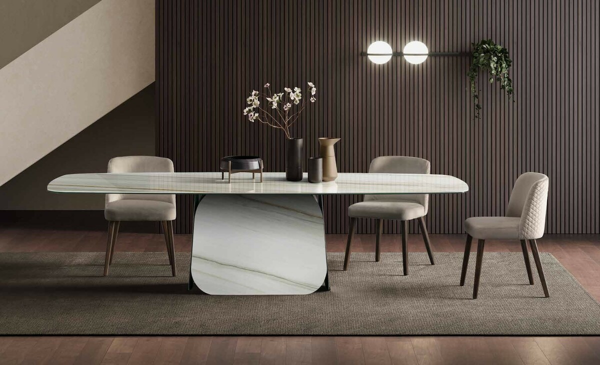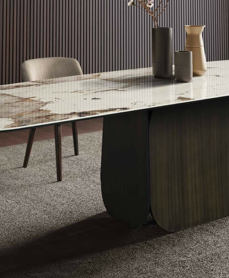 Идеальное сочетание практичности и эстетической привлекательности. Простая и изящная конструкция состоит из четырёх панелей в форме суперэллипса, которые могут контрастировать или гармонировать с поверхностью столешницы по цвету и текстуре. Стол предлагает обширные возможности для экспериментов с различными сочетаниями материалов.