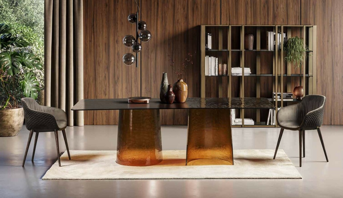 Стол обеденный итальянский Aria Domitalia из гнутого стекла с эффектом Martellato бочкообразный