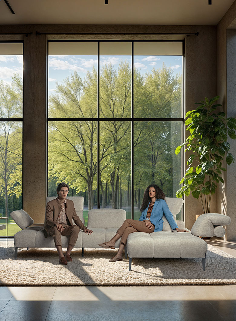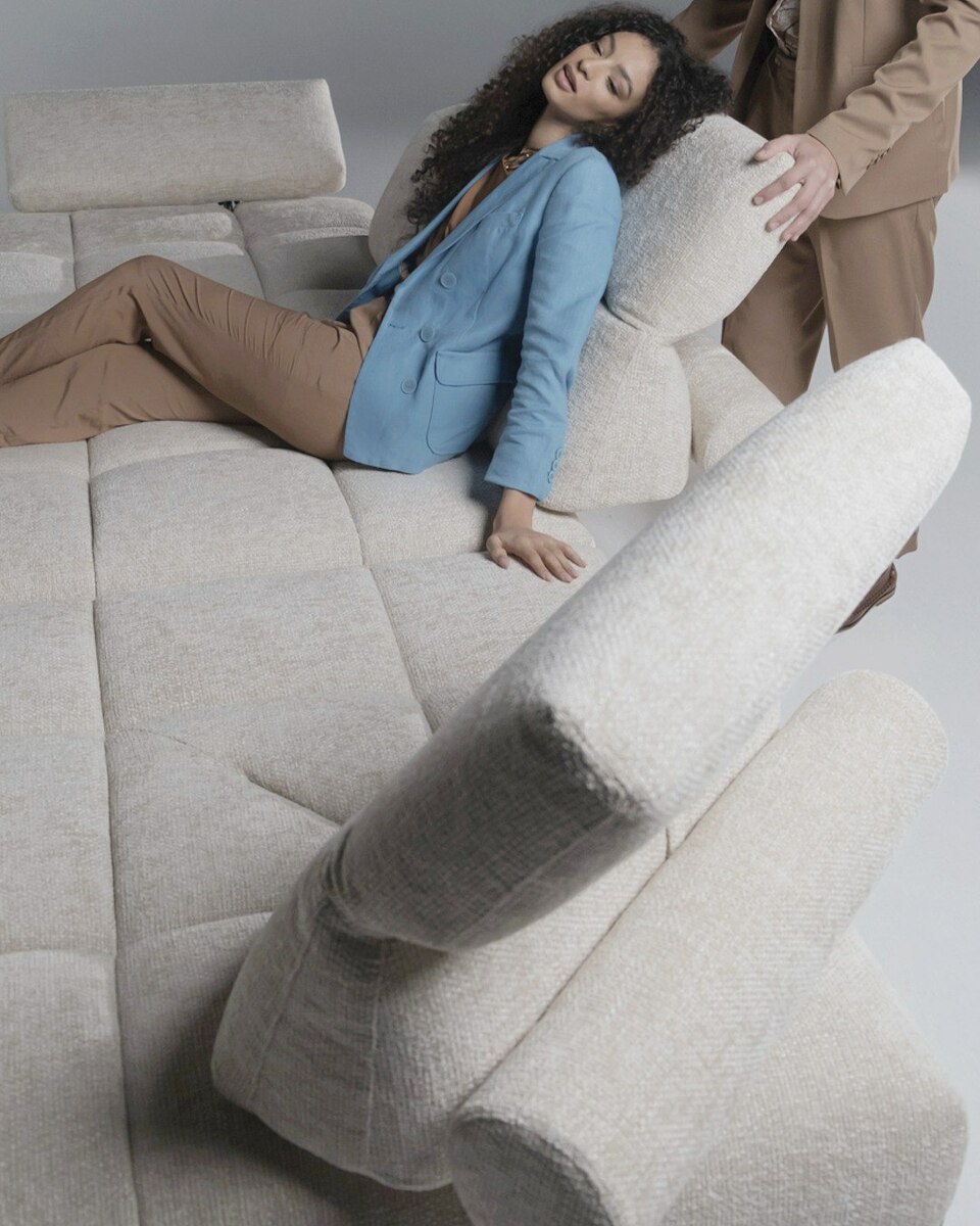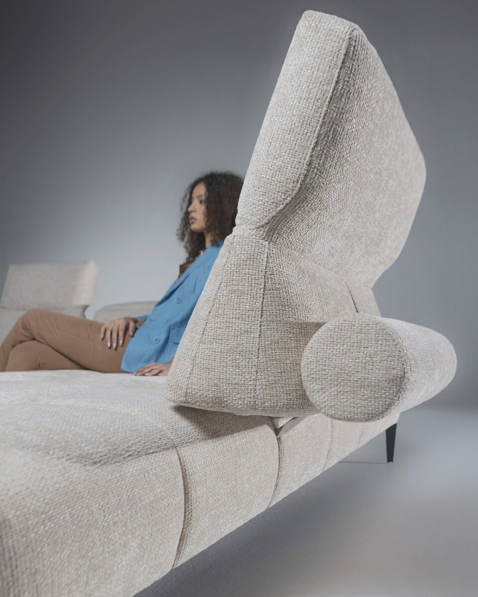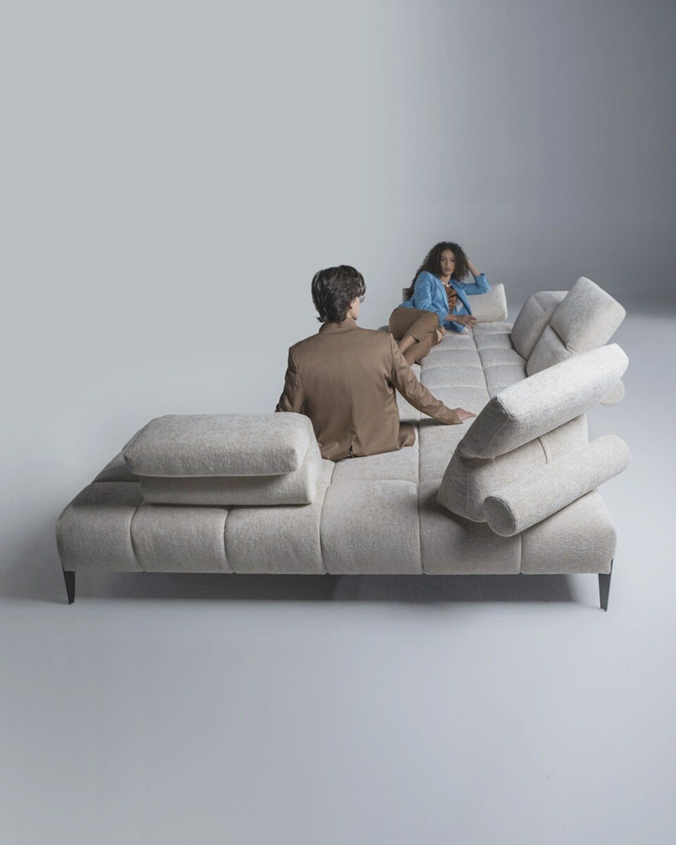 Диван готовый к отгрузке со склада в Италии Skyline – диван в современном стиле из коллекции 2024 года, представленной на миланской выставке. Облегченный силуэт дивана формируется высокими скошенными ножками, поднимающими каркас на 19 см от пола, геометричной простежкой и подлокотниками, способными изменять угол наклона и сдвигаться в сторону. Спинка дивана оснащена регулируемым подголовником, который не только обеспечивает дополнительный комфорт, но и изменяет внешний вид дивана в зависимости от положения. Диван специально спроектирован таким образом, чтобы привлечь на себя все внимания и стать центральным элементом интерьера. Рулонные валики сзади спинок являются их опорой и декоративным элементом одновременно. Диван прекрасен со всех ракурсов. Механизмы, встроенные в спинку и в подлокотники увеличивают глубину сиденья на 42 см и ширину на 28 см с каждой стороны.. Подлокотник можно поднимать в любом положении. Металлические ножки поставляется в стандартной матово-черной отделке.