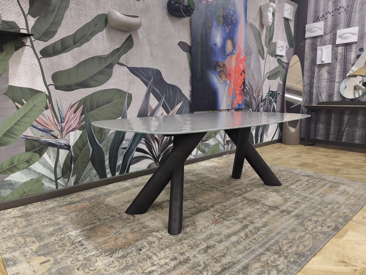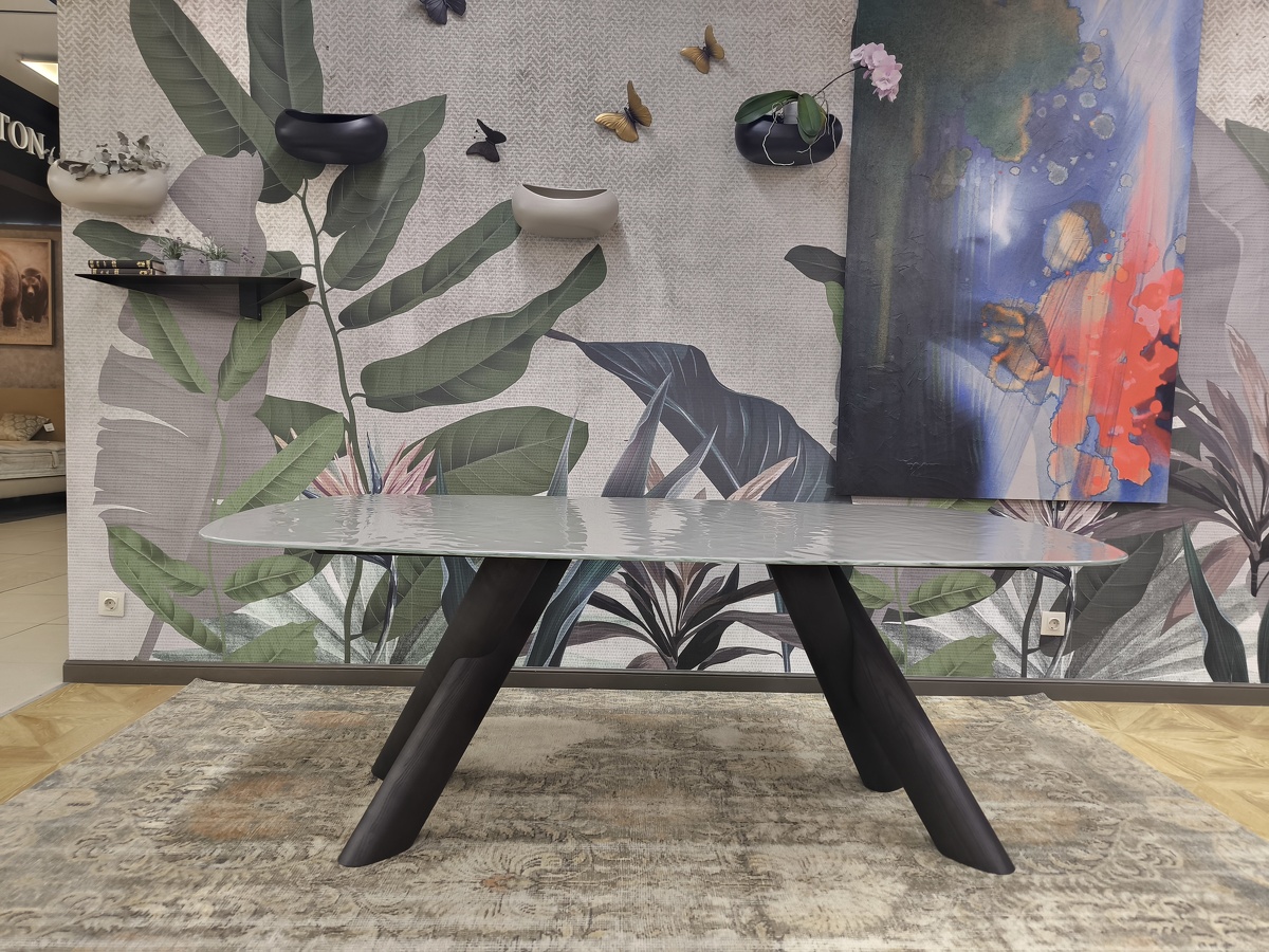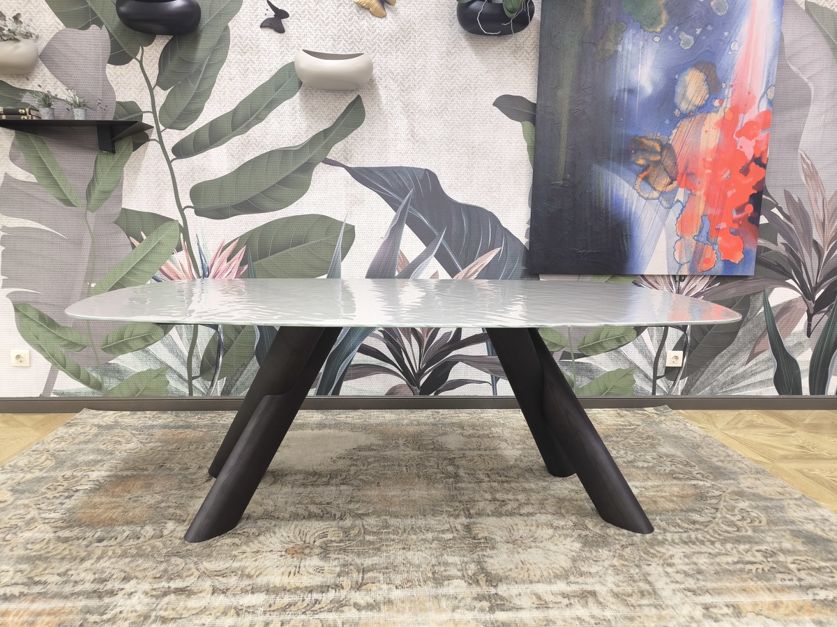 Стол является отражением баланса солидности конструкции и визуальной легкости. Дизайнерская особенность стола заключается в рустикальном основании, изготовленном из массива дерева в виде скульптурных и динамичных пересечений, создающим при этом игру объемов и наклонных линий.