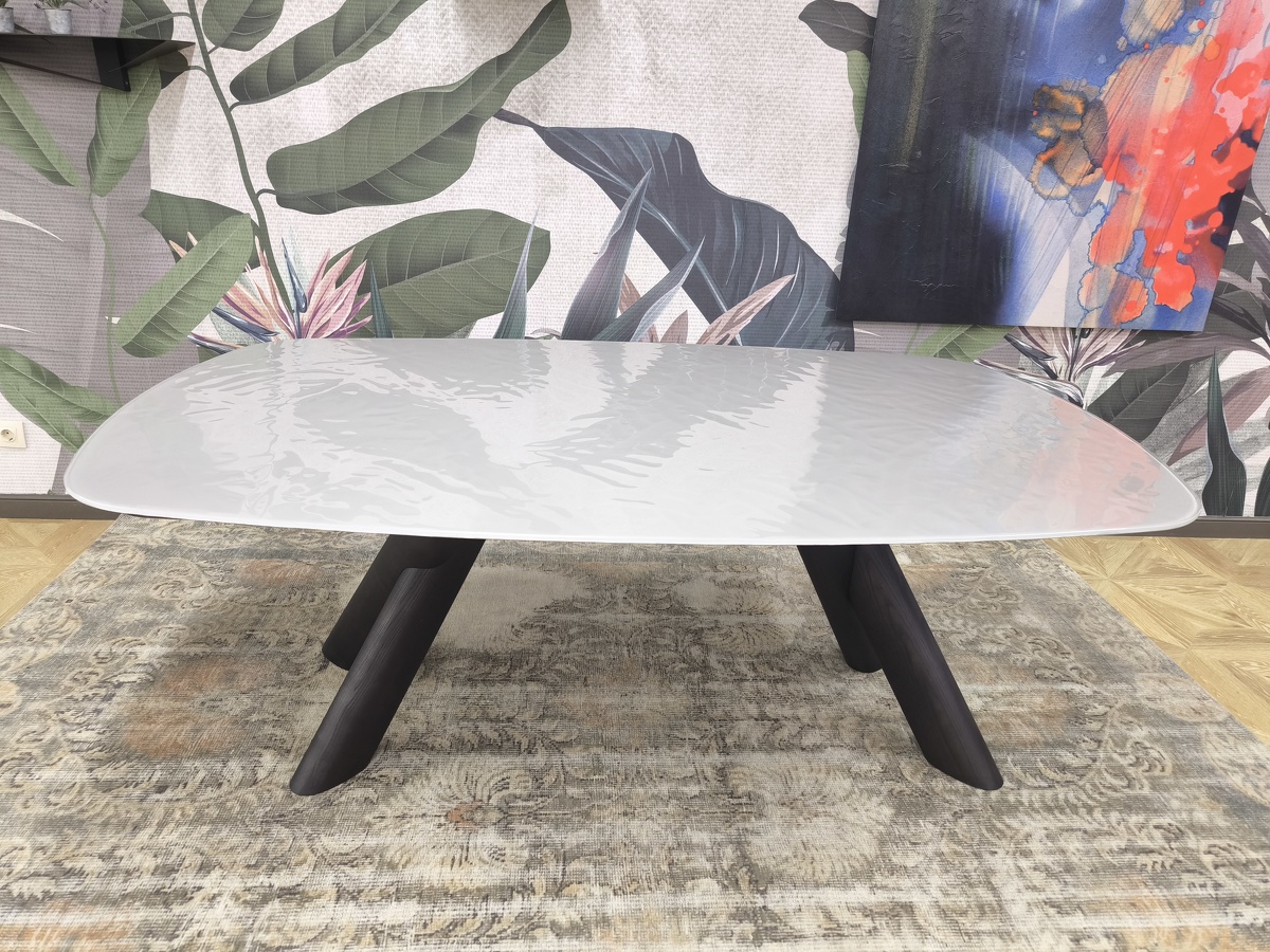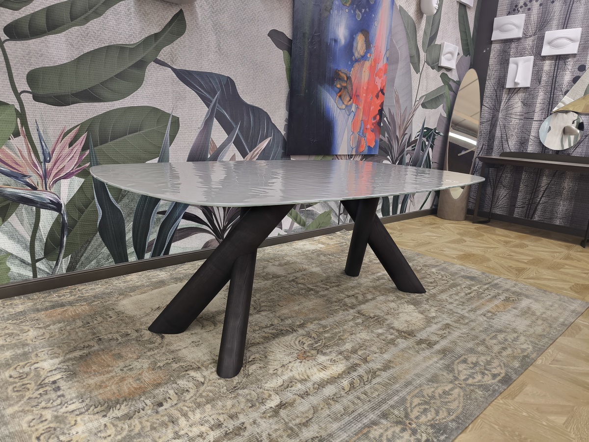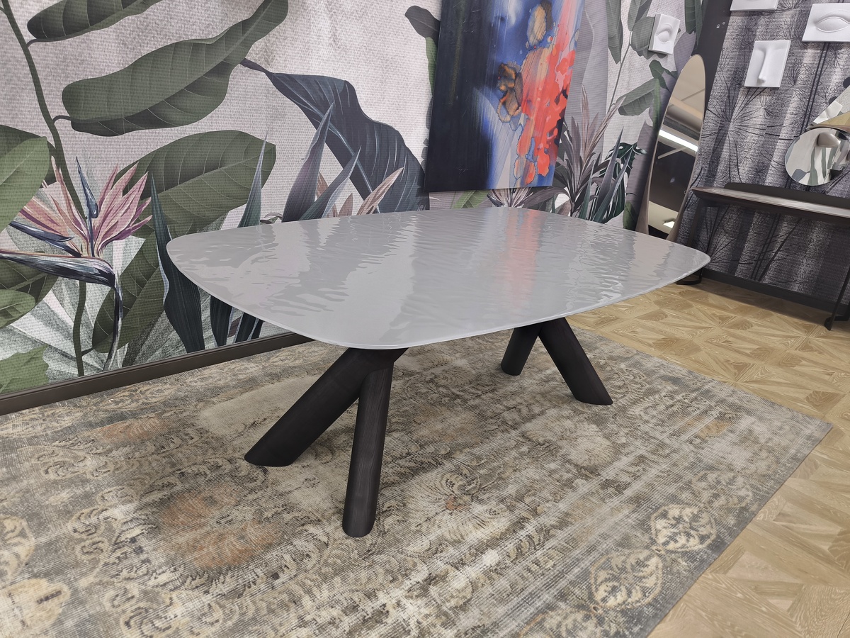 Стол является отражением баланса солидности конструкции и визуальной легкости. Дизайнерская особенность стола заключается в рустикальном основании, изготовленном из массива дерева в виде скульптурных и динамичных пересечений, создающим при этом игру объемов и наклонных линий.