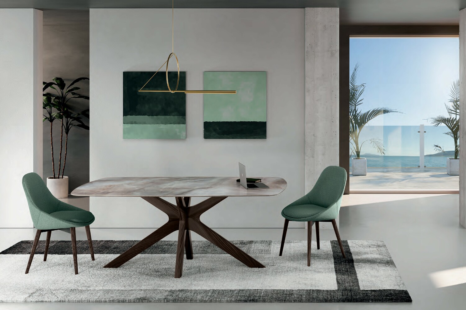 Gemini - это изысканный и необычный стол с плавными и мягкими линиями, перекликающимися между собой, создавая яркий визуальный эффект. На основании в виде звезды, выполненной из массива ореха, расположена солидная столешница из керамики, имитирующей натуральный глянцевый алебастр. Поверхность нежного молочного цвета с просвечивающейся венатурой, переходящей от серого до оранжевого цвета, придает столу элегантность и уникальность. Результат творческих исследований различных стилей и направлений, Gemini является настоящим героем living-зоны, гармонично вписываясь как в пространство современного дизайна, так и в объекты, где преобладает роскошь и классический стиль.
