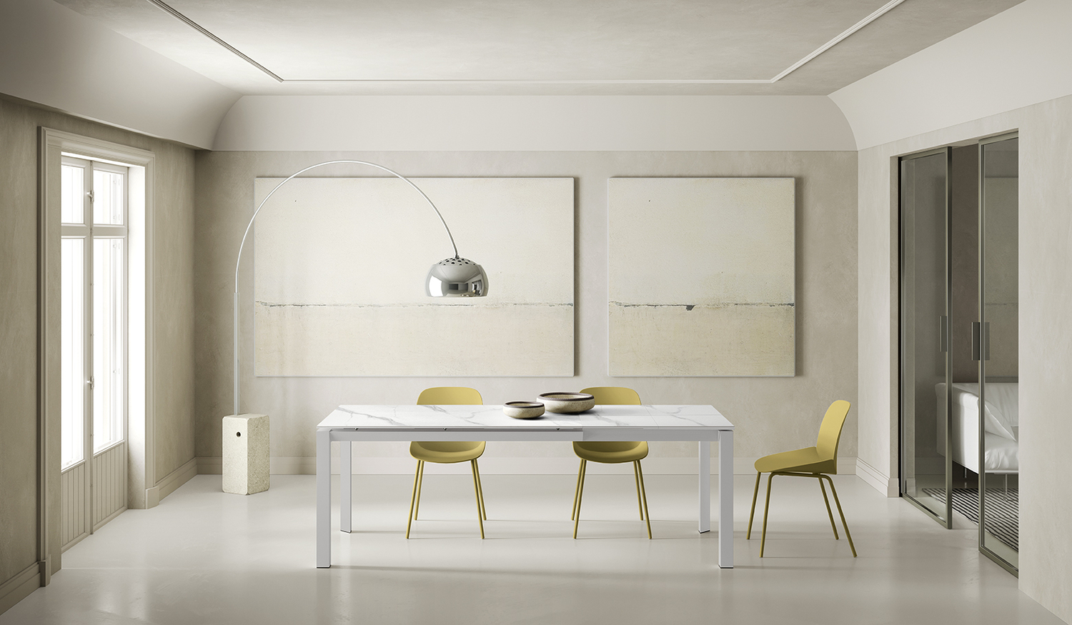 Компактный обеденный стол с керамической столешницей и металлическими ногами по периметру стола. Керамическая столешница имеет толщину 11 мм и имитирует белый мрамор Carrara. Стол увеличивается по длине за счет вставок, раскладывающихся по принципу книжки. Вставки изготовлены из МДФ и окрашены в один тон со столешницей. Длину стола можно увеличить за счет одной или двух вставок.