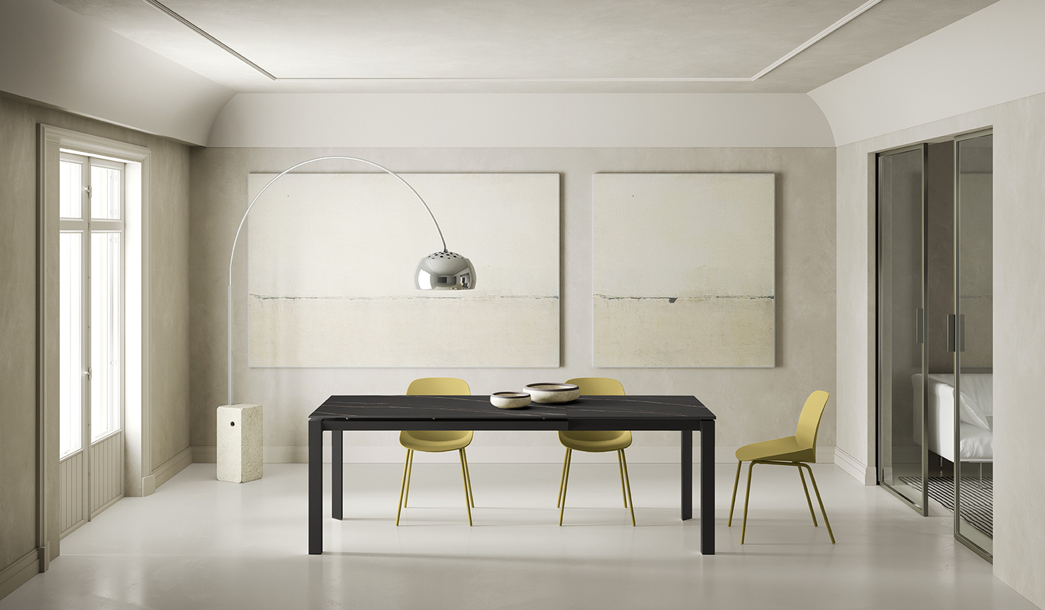Компактный обеденный стол с керамической столешницей и металлическими ногами по периметру стола. Керамическая столешница имеет толщину 11 мм и имитирует натуральный мрамор Portoro. Стол увеличивается по длине за счет вставок, раскладывающихся по принципу книжки. Вставки изготовлены из МДФ и окрашены в один тон со столешницей. Длину стола можно увеличить за счет одной или двух вставок.