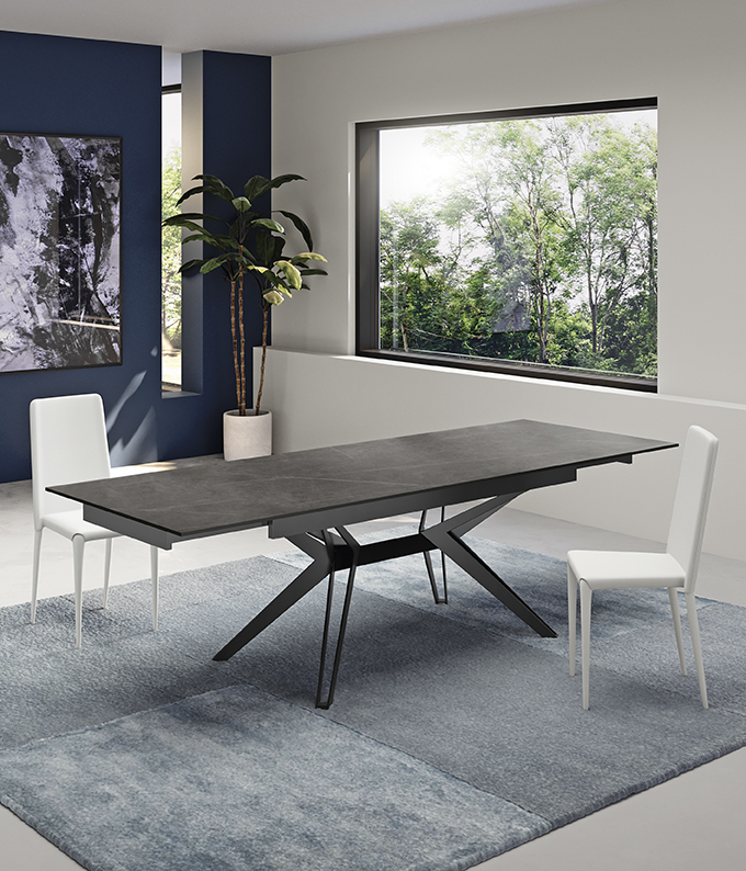 Способность акцентировать на себе внимание - это главная особенность этого раскладного стола в современном индустриальном стиле. Элегантная столешница из керамики гармонично сочетается с прочным основанием из черного металла. Match во всех свои трех вариантах предлагает разнообразие возможных сочетаний между отделкой столешницы и формой основания, отвечая разнообразным вкусам и отражая дух его владельца через ярко-выраженную индивидуальность. Благодаря механизму раскладывания и дополнительным вставкам стол позволяет разместить за ним до 10 человек. Он становится идеальным союзником в создании удобных пространств даже в самых скромных по размеру помещениях.
