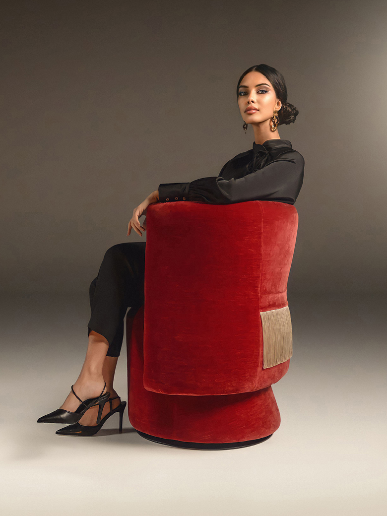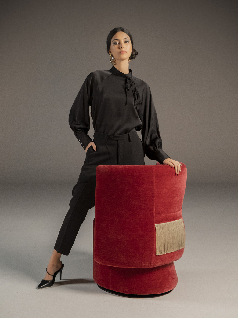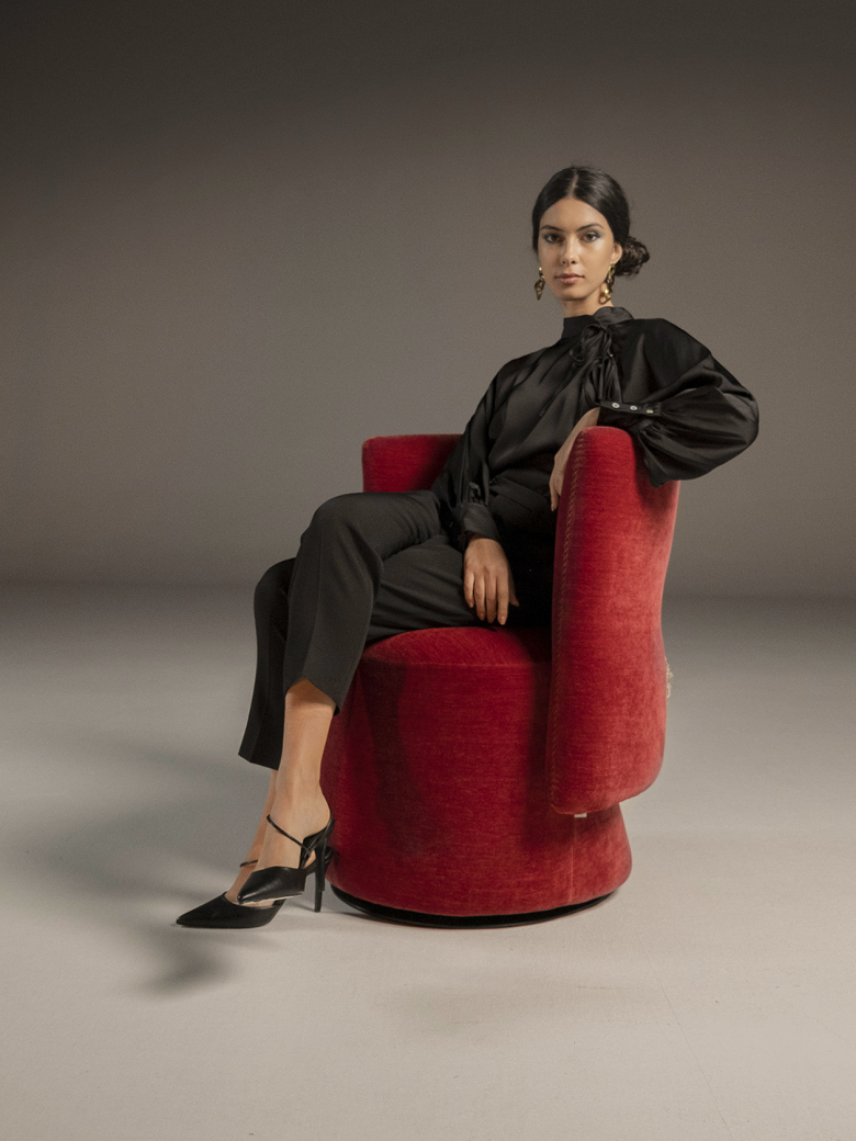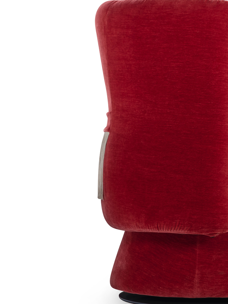 Dona G - это часть коллекции и продолжение креативной идеи кресла Giuggiola, которое олицетворяет шарм настоящей Signora Italiana, каждый раз преобразующейся в различных интернациональных одеяниях. Это уже четвертое стилистическое решение, на этот раз подчеркивающее изысканность и харизму испанского стиля. Кресло, доступное в поворотной версии или с контейнером, становится ярким выражением бренда Made in Italy в мире и знаменует собой продолжение коллекции, которая создает для каждой страны свою собственную Giuggiola. Если основная часть в виде сиденья остается всегда неизменной, то задняя часть преображается за счет богатого хвостового декоративного элемента, напоминающего убранство вечернего платья. Форма спинки напоминает шиньон, которым украшают себя женщины в Испании. Кресло словно экспрессивная испанка в подчеркивающем силуэт шикарном платье с гордым профилем, оформленным строгой челкой.
