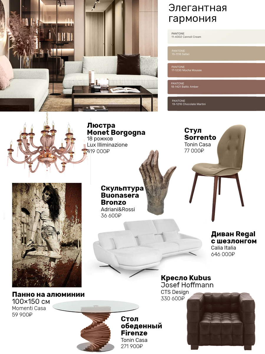 Представляем палитру «Элегантная гармония», вдохновлённую природным балансом и синтезом стилей. Палитра на основе Mocha Mousse — настоящий гимн равновесию и утончённой красоте. От лёгкого и нежного кремового оттенка Cannoli Cream до богатого и загадочного тёмно-коричневого Chocolate Martini — экспериментируйте и создавайте свой гармоничный и современный интерьер. Mocha Mousse станет идеальной базой для основных поверхностей, будь то металлик, матовые покрытия или бархатистые текстуры. Он легко комбинируется с другими цветами палитры, становясь фоном для смелых акцентов и декора в оттенках Baltic Amber или Safari. «Элегантная гармония» предлагает идеальный баланс между природой и современным стилем, создавая атмосферу спокойствия и уверенности.