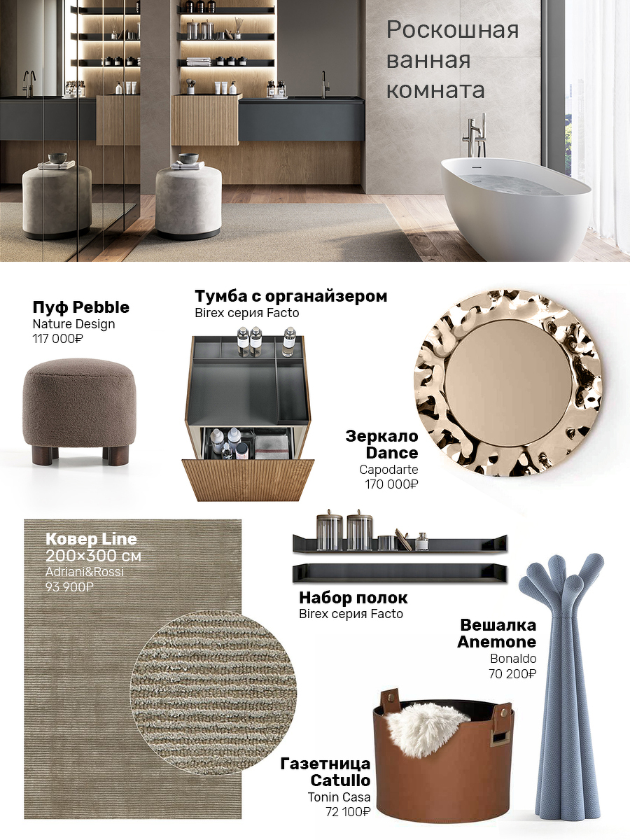 Ванная комната от Birex — это удобство, продуманные формы и высококачественные материалы.Глянцевые поверхности полок и зеркала, дерево и натуральные материалы пуфа и ковра, мрамор раковины и геометрический фасад тумбы создают гармоничный ансамбль различных фактур и текстур. Стильные полки и органайзер для аккуратного хранения косметики и средств личной гигиены делают ванную комнату еще более организованной и удобной.Композиция для ванной с мебелью Birex выделяется своим выразительным дизайном, где эстетика и функциональность гармонично сочетаются, создавая пространство, в котором каждая деталь имеет значение.
