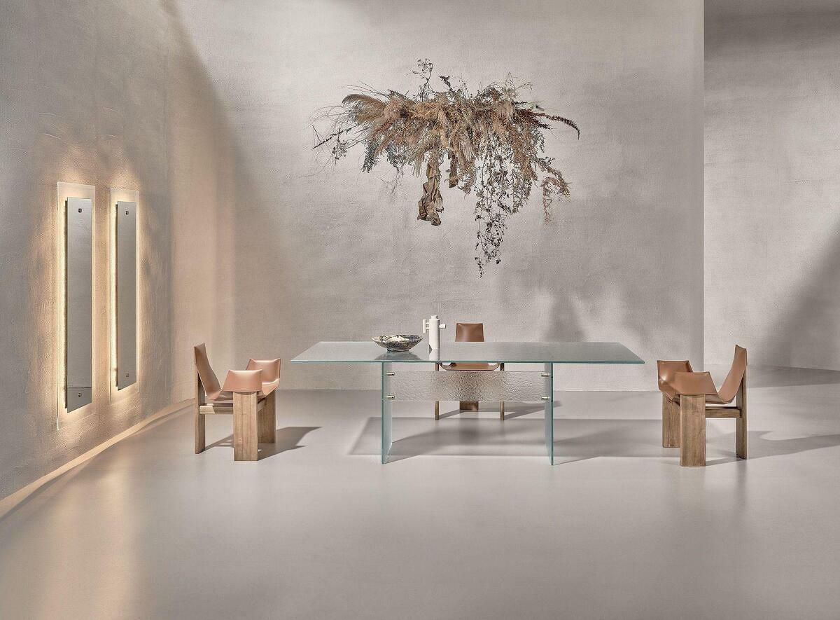 Выставка 2025 I Saloni подтвердила, что итальянские столы, изготовленные полностью из стекла с эффектом Martellato — новомодная тенденция, которая захватила мир дизайна мебели.