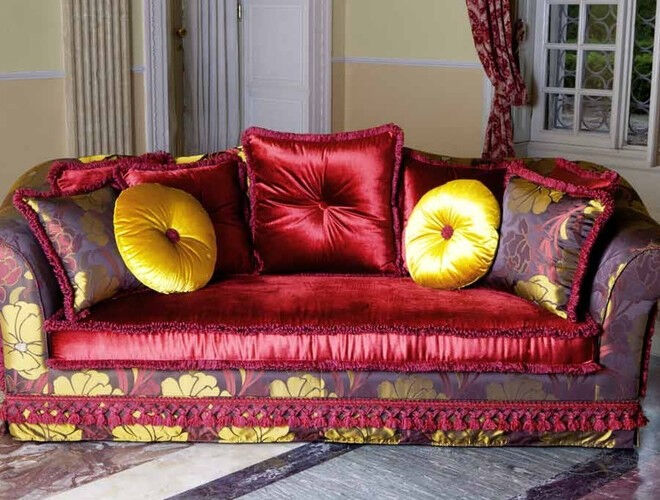 Бархат, гобелены, жаккарды и роскошный дамасский шелк оттеняются драгоценной тесьмой, кистями, миниатюрными розетками и цветами.