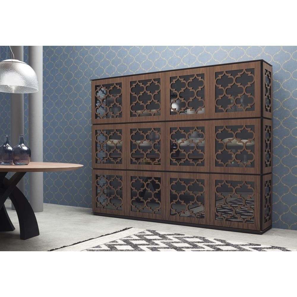 100% Made in Italy. Высокий уровень.Витрина из коллекции 2016 года и является частью программы Marrakesh. Фасады выполнены из резного дерева и закаленного прозрачного стекла.Опционально можно добавить заднюю зеркальную стенку и подсветку или подсветку с удаленным доступом. Вся коллекция выполняется в двух цветах: орех и венге.