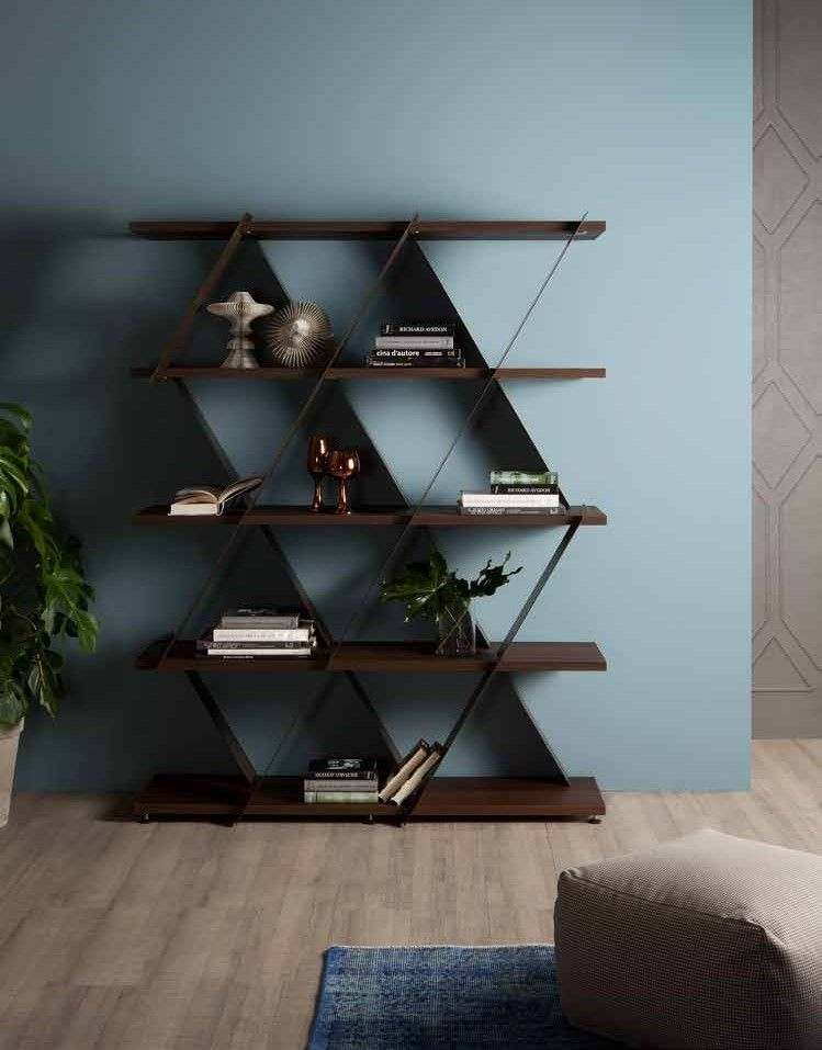 Изящная библиотека с каркасом из окрашенного металла в цвете белый, бледно-розовый или бронзовый. Полки шпонированные, в цвете орех, темный дуб или дуб натуральный.