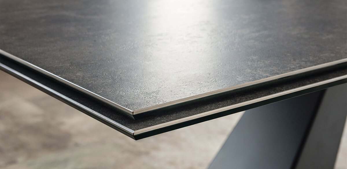 Стол на металлическом основании, окрашенном в черный, белый цвет, графит или сталь. Столешница из керамики под мрамор в цвете