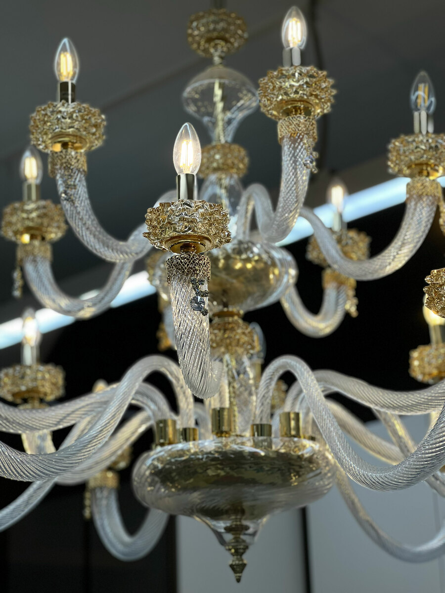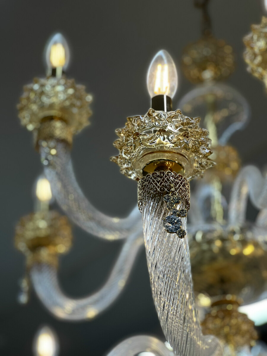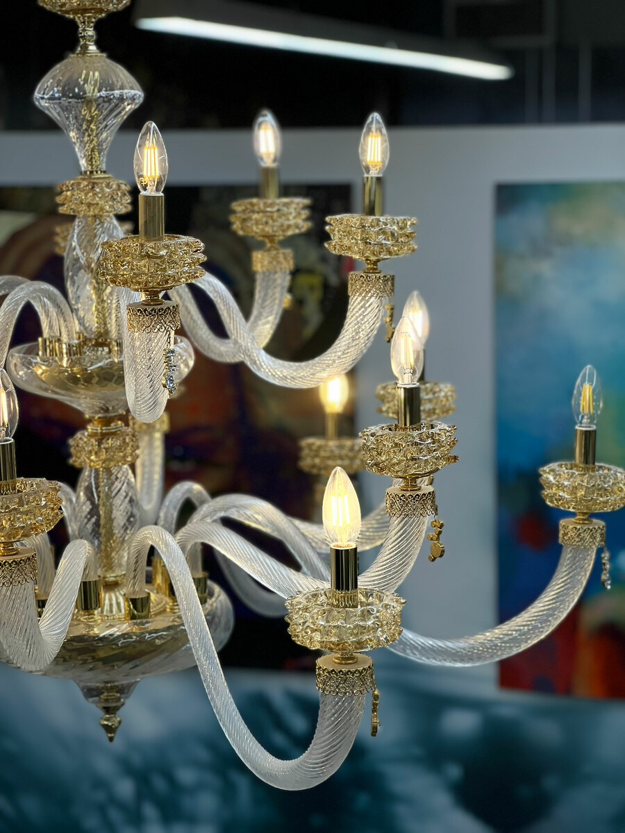 Шикарная двухъярусная люстра на 18 рожков из Муранского прозрачного стекла с элементами из стекла янтарного цвета.