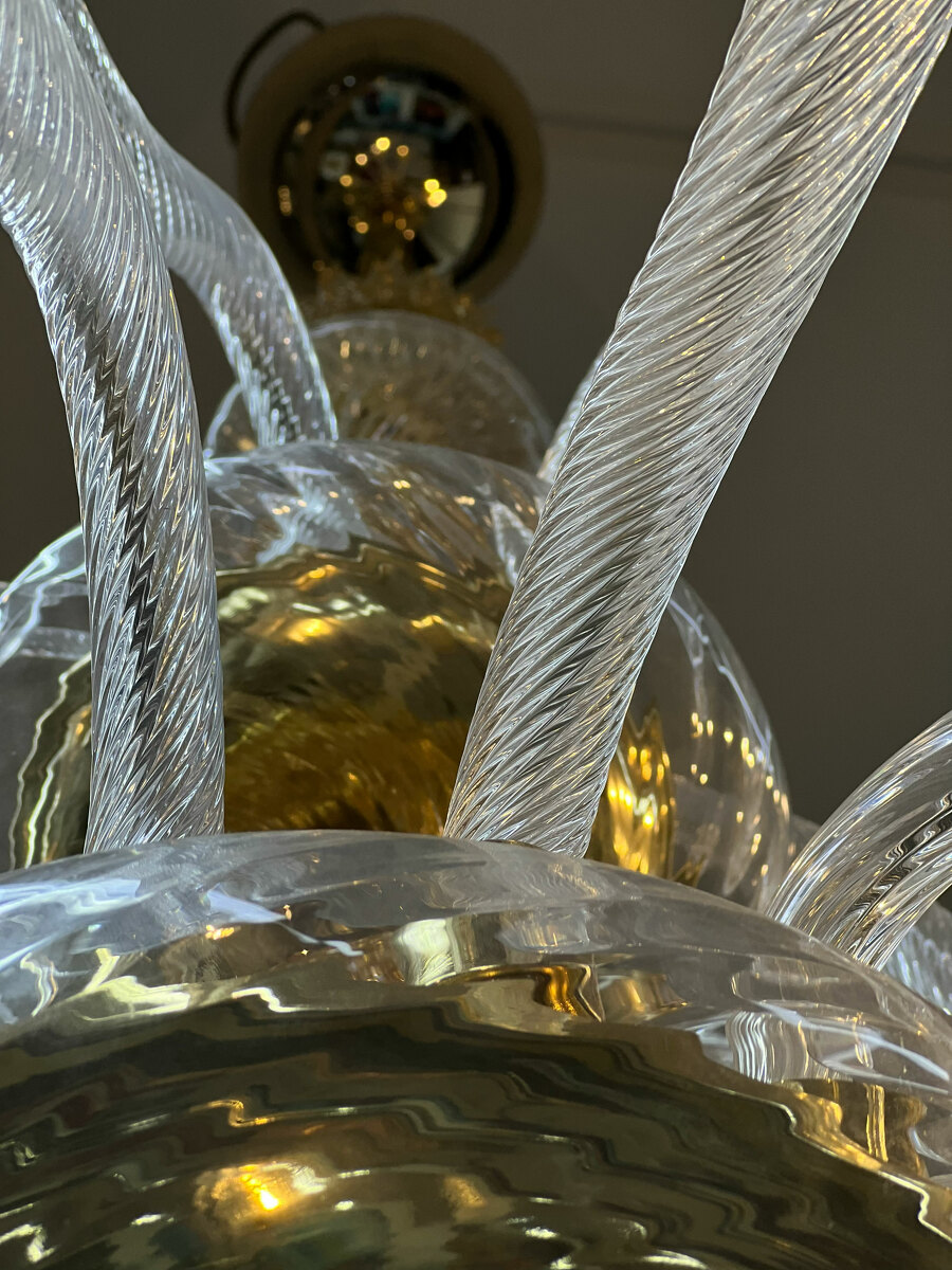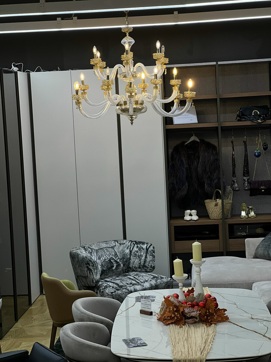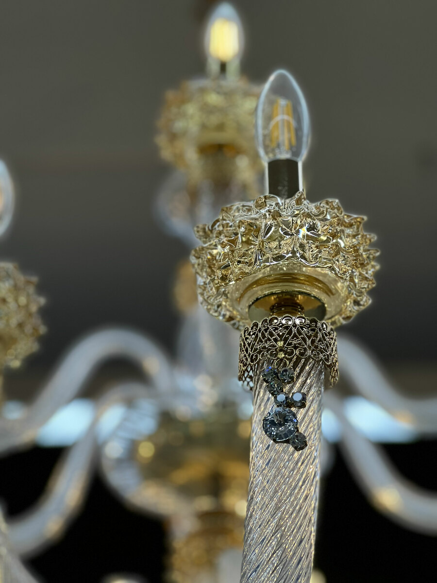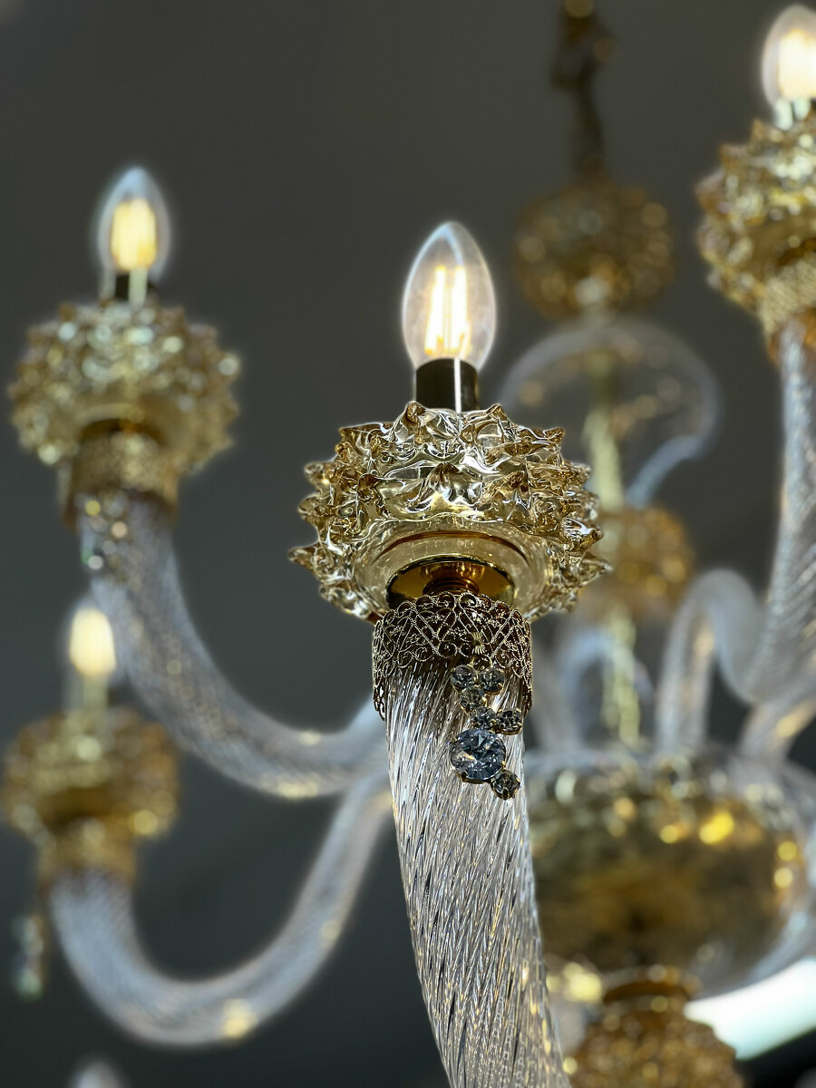 Шикарная двухъярусная люстра на 18 рожков из Муранского прозрачного стекла с элементами из стекла янтарного цвета.