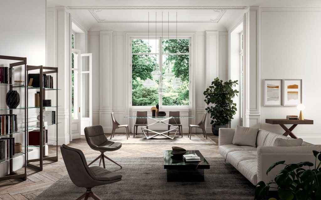 Динамичное основание из металла и прозрачная столешница с двойным фацетом и дополнительным шлифованием. Геометрия в основе дизайна фокусирует внимание на столе, как на центральном элементе интерьера.