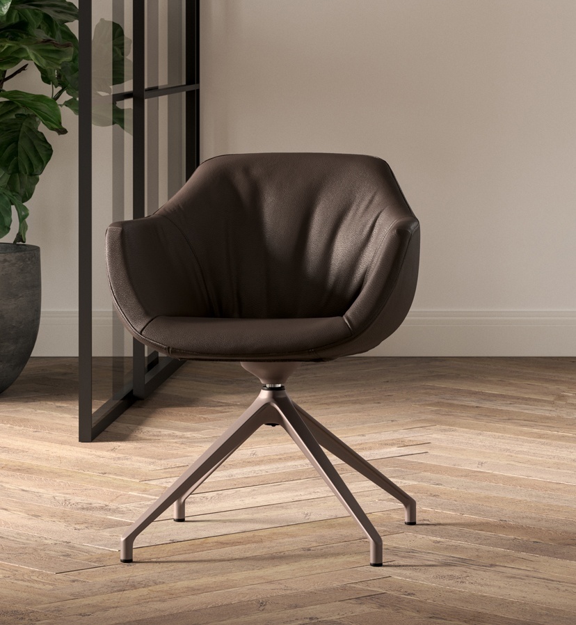 Вращающееся кресло с металлическим основанием и сиденьем, обитым бархатом, ЭКО-нубуком или кожей.