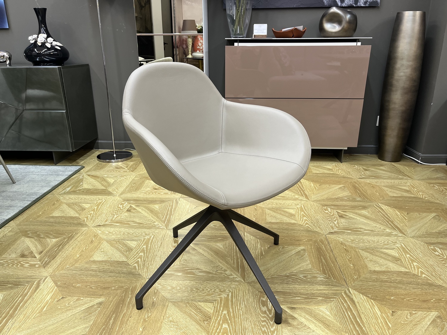 Вращающееся кресло с сиденьем, обитым кожей, бархатом или эко-нубуком. Металлическое основание.