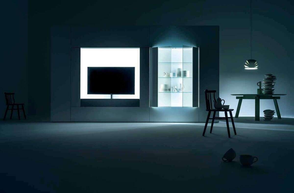 Зеркало для мимолетного взгляда перед выходом из дома, телевизор для часов досуга, письменный стол для работы, чтения или музыки. Дополняют разноплановость Roomy боковые элементы, ящики и откидные фасады.