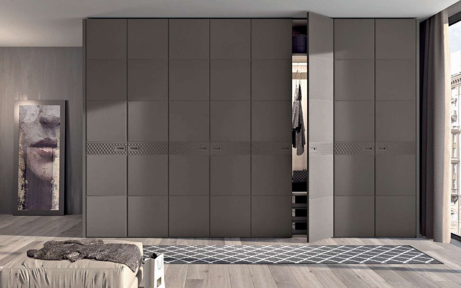 Его обитые экокожей фасады расчерчены горизонтальными линиями. Сам шкаф гладкий, но по центру проходит простеганная вставка с ручками. Каркас шкафа окрашен в тон фасадов.