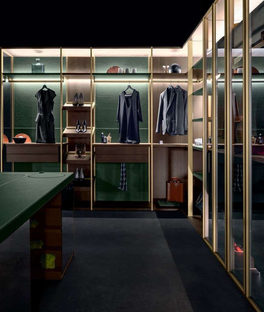 В верхние полки встроены светодиодные светильники Twin, которые направляют свет как вверх так и вниз, увеличивая и так шикарный визуальный объем гардеробной, сформированный отсутствием перегородок.