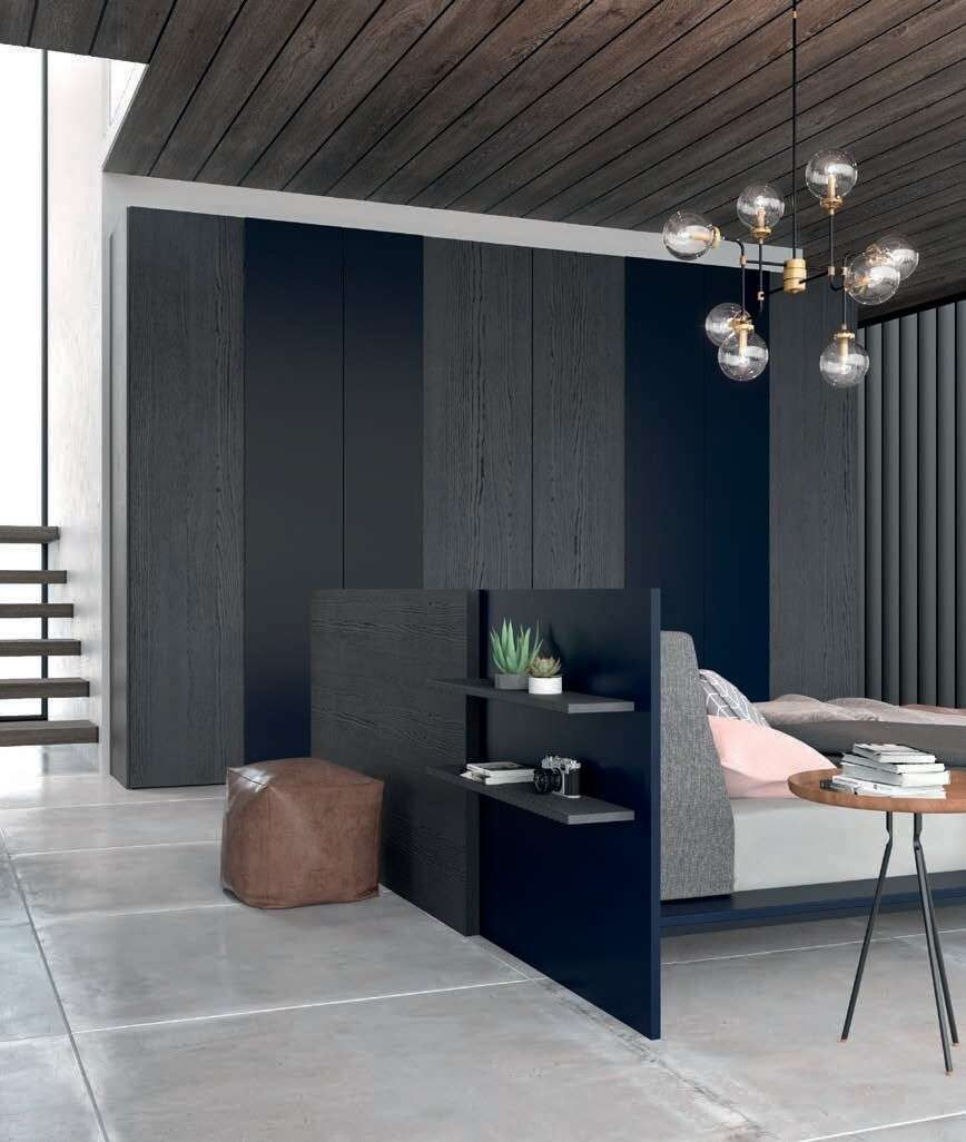 Революционный дизайн кровати Soulwave: широкое, выступающее основание со скосом 30 градусов и изголовье, выполненное из сдвоенных панелей в различной отделке, которые образуют перепад-углубление для светодиодной подсветки. Изголовье кровати укомплектовано большими тканевыми подушками. Как видно на фото, кровать может быть расположена по центру комнаты, обыгрывая дизайн интерьера разноуровневыми элементами и полками.