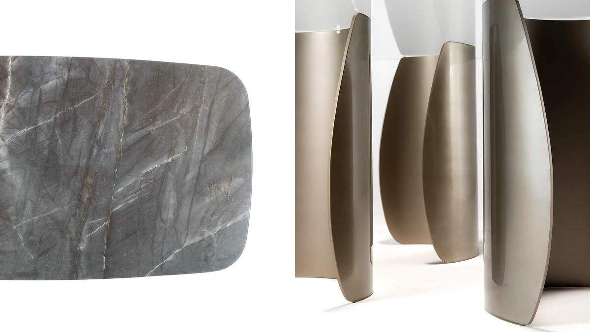 Обеденный стол на основании из гнутого экстрапрозрачного стекла толщиной 10 мм. С внутренней стороны элементы основания, выполнены в форме лепестков окрашены в бронзовый цвет. Доступны различные варианты столешниц: стекло, экстрапрозрачное стекло, MarmoGlass, дерево.