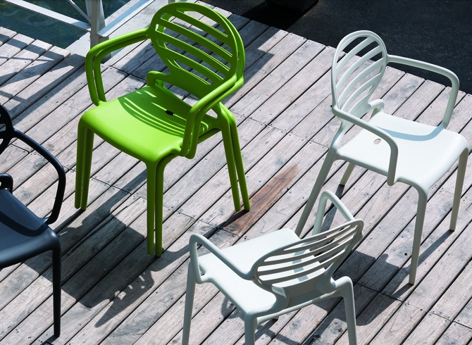 Стул изготовлен из полипропилена, усиленного стекловолокном. Стул формован посредством специальной технологии Air Moulding. Доступен в различных цветовых вариантах. Подходит для использования indoor и outdoor.