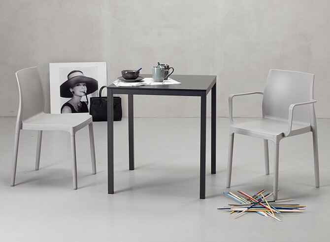 Сиденье стула изготовлено из переработанного технополимера, усиленного стекловолокном. Ножки алюминиевые и покрытые технополимером. Стул для использования indoor и outdoor. Стулья штабелируются друг на друга.