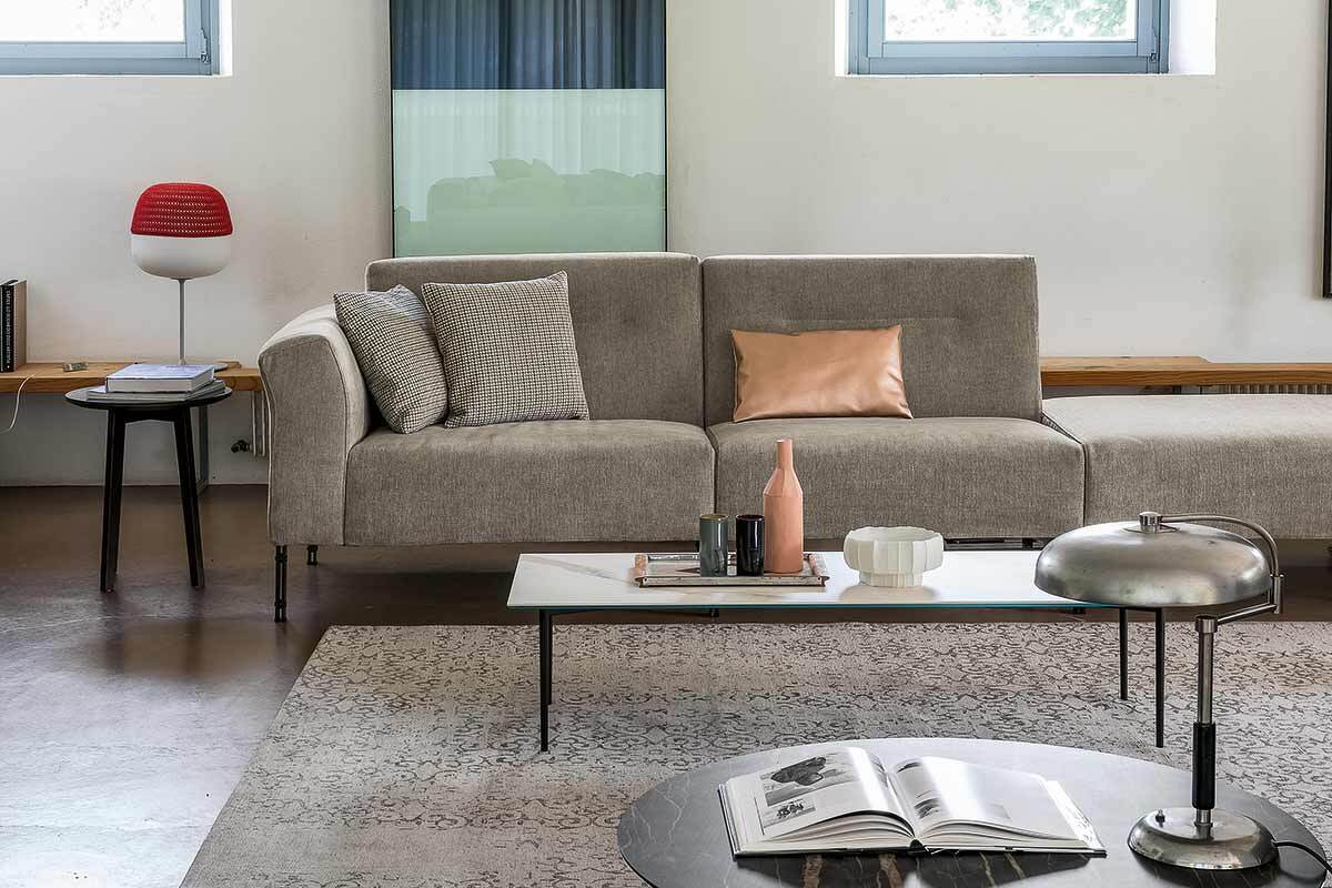 Для дивана Liko характерно удачное сочетание мягких элементов и промежуточных вставок из дерева в различных отделках, которые функционально можно использовать как журнальные или рабочие столики. Столики могут иметь также столешницу из керамогранита и служить терминальным элементом.