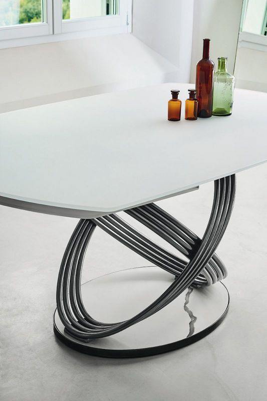 Элегантность утонченной скульптуры вносит, но только на первый взгляд, некоторое противоречие и контрастирует с решительным характером стола и богатыми отделочными материалами. Будь то стекло, мрамор, керамика или ценный орех, конечный результат всегда великолепен. Это абсолютный баланс цвета и форм.