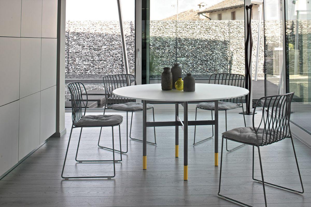 Очень элегантный стол на стальном основании. Изящно дополняют силуэт стола окрашенные наконечники на ногах. Различные варианты отделки столешницы: