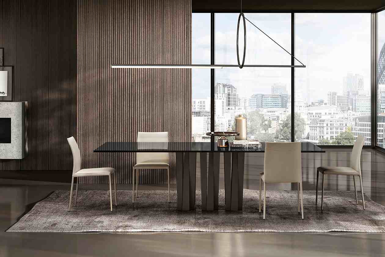 Присутствие геометрии в дизайне создает интригующий и многогранный объем. Лучи света проходят сквозь ажур рисунка, созданного металлом в непрерывном его отражении. Прямоугольная или бочкообразная столешница может быть выполнена из дерева, стекла, мрамора или керамики.