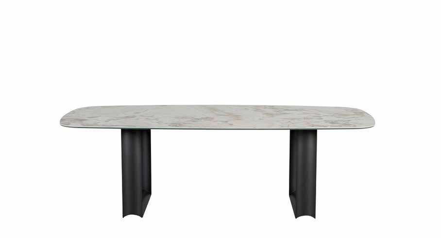 Фиксированный стол с окрашенным стальным основанием в виде двух квадратных опор. Алюминиевый каркас служит дополнительной опорой столешницы.