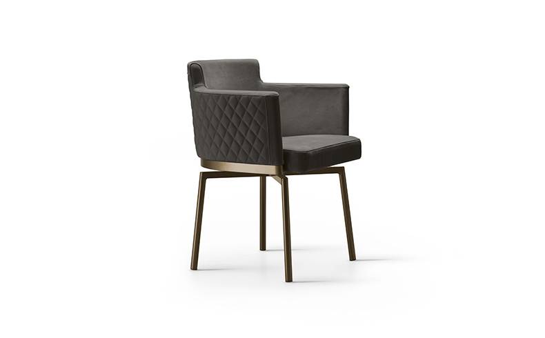 Кресло на металлическом, крутящемся основании в цвете бронза, оснащенном возвратным механизмом, позволяющим сесть за стол, не отодвигая все кресло, а только повернув сиденье. Далее оно возвращается в исходное положение.