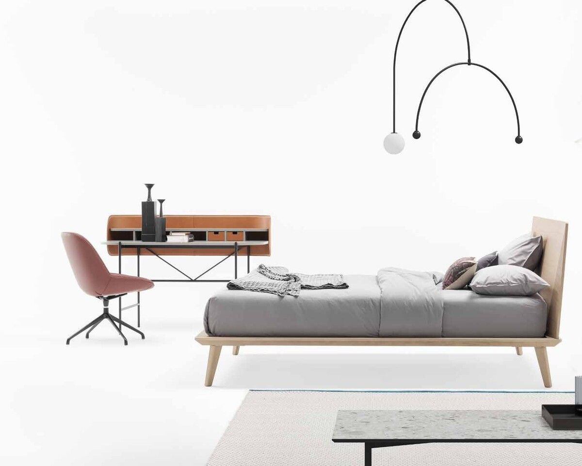 Простая, но изысканная деревянная кровать. Игра линий, сходящихся и расходящихся, определяет ее дизайн. Сформированный таким образом фацет на изголовье повторяется и в форме основания и ножек. Объемная геометрия выгодно смотрится за счет натурального рисунка, образуемого текстурой дерева.