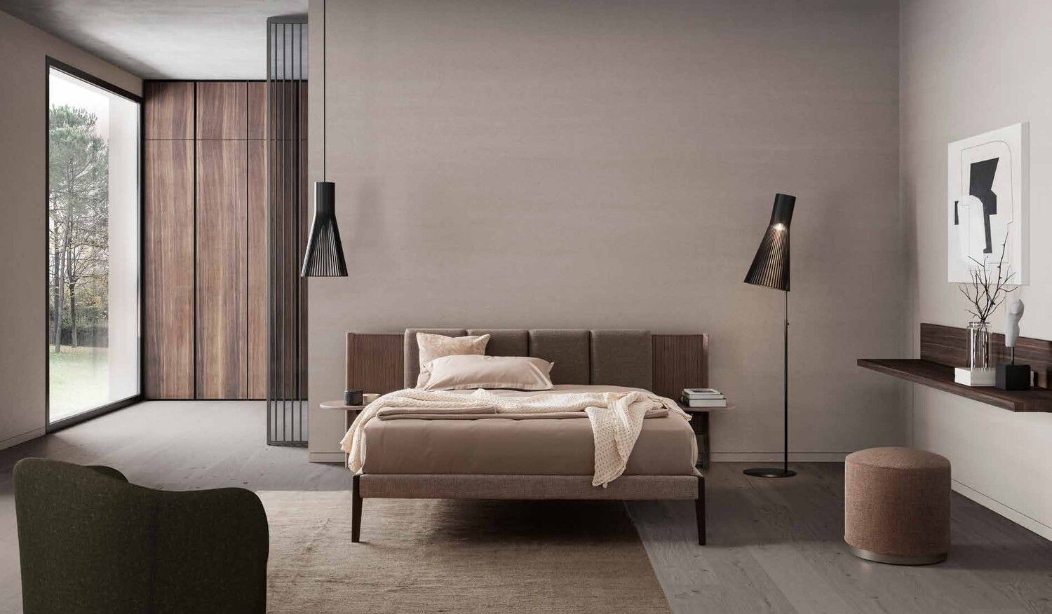Тысяча полос для деревянного рельефного изголовья. Они задают общий ритм, являясь предисловием к широким полосам мягкой, элегантной спинки кровати, выдержанной в буржуазном стиле.