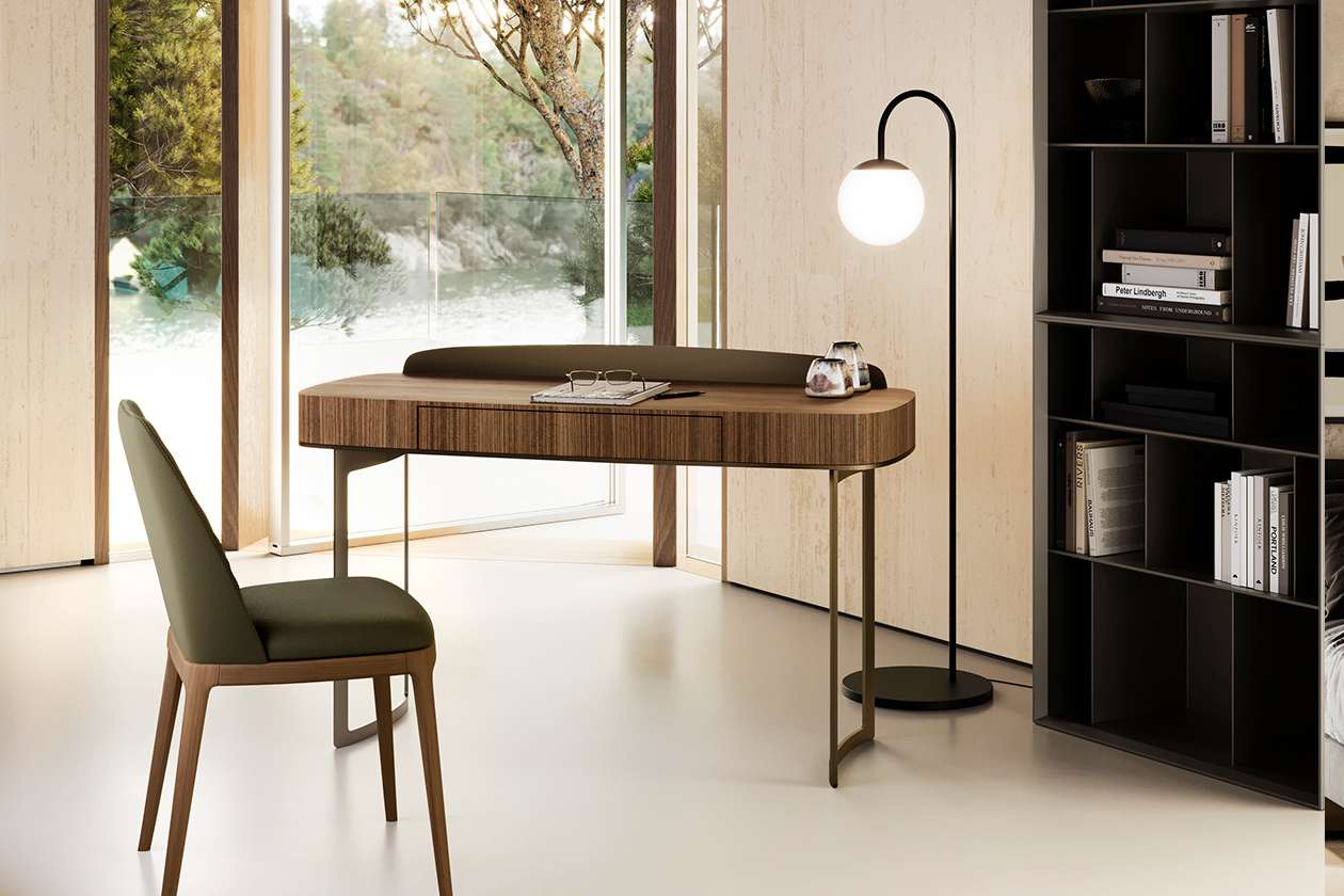 Lyra Desk - это элегантный письменный стол для домашнего офиса с чистыми и абсолютно совершенными линиями. .Спроектированный дизайнером Ollen Pal, Lyra Desk выполнен с выдвижным ящиком по центру, имеет в основе металлический каркас и украшен металлическим бортиком. Шпонированная столешница эффектно обрамлена металлическим кантом в цвете бронза.. Деревянный верх поддерживают изящные, изогнутые металлические ножки. Особый шарм столу придает металлический бортик. Этот элегантный предмет интерьера может быть использован и как туалетный столик благодаря надстроенному зеркалу с фацетом. Lyra Desk - это изысканный и удобный предмет мебели в неоклассике.