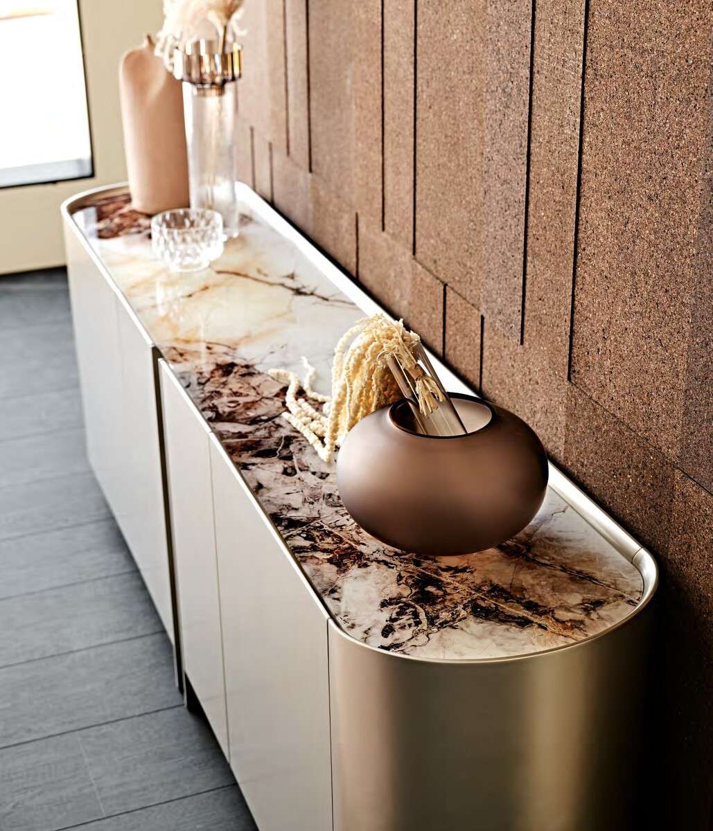 Звездным элементом современного серванта Dynasty, несомненно, является декорированное стекло с принтом, воспроизводящее завораживающие прожилки натурального мрамора. Верхняя часть выполнена из печатного стекла, как и центральная вертикальная часть, расположенная на уровне ниже дверей из окрашенного дерева. Этот дизайнерский сервант богат тщательно подобранными деталями, такими как закругленные боковины или край верхней столешницы, приподнятый над стеклянной пластиной. Таким образом, акцент делается на функции мебели - заботиться о дорогих нам предметах, одновременно выделяя их.