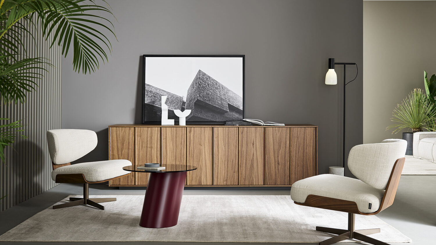 хорошо структурирован и вдохновлен фасадами зданий в стиле модерн: в вертикальных линиях скрыты пазы, которые служат для открытия дверок. Предназначение структуры, очерчивающей буфет, легкой и практически незаметной, – сдержанно и элегантно подчеркнуть размеренную регулярность фасадных элементов. Буфет Backdrop предлагается в вариантах орех каналетто, дуб угольный или дерево с глянцевой лакировкой карамельного цвета.