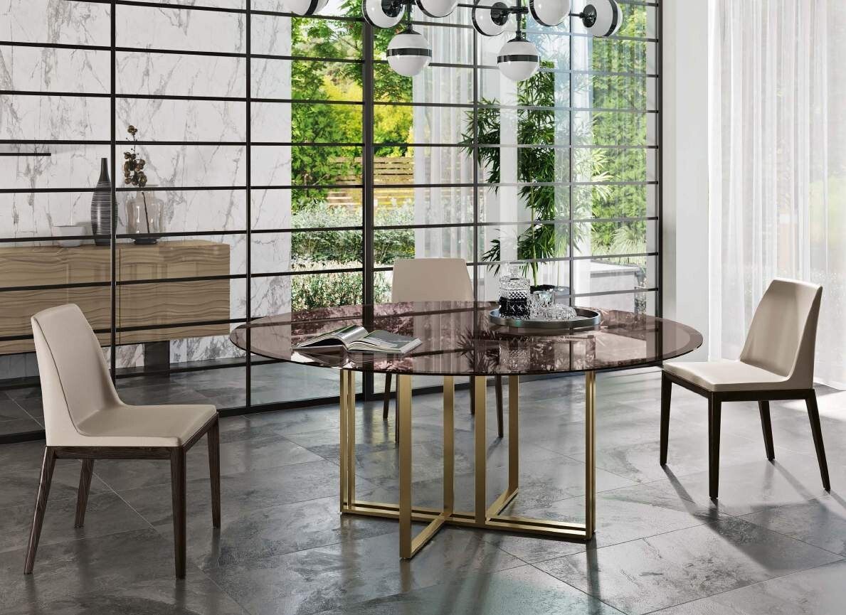 Стол Dakota компании Piermaria Design представляет собой круглую столешницу из мрамора, которая изящно опирается на пересекающиеся скульптурные бронзовые ножки, чтобы создать визуальный эффект невесомости.