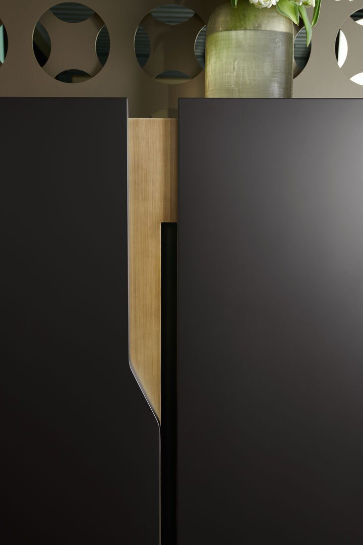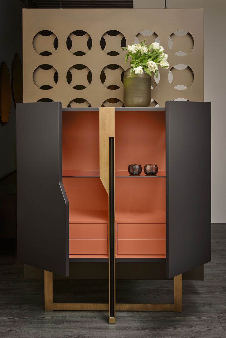 Лакированный деревянный корпус и металлическое основание прекрасно сочетаются друг с другом. Металл, начиная с основания, поднимается и врезается в структуру, предлагая беспрецедентный и изысканный декоративный эффект. Внутри пространство разделено полированной полированной стеклянной полкой и четырьмя ящиками.