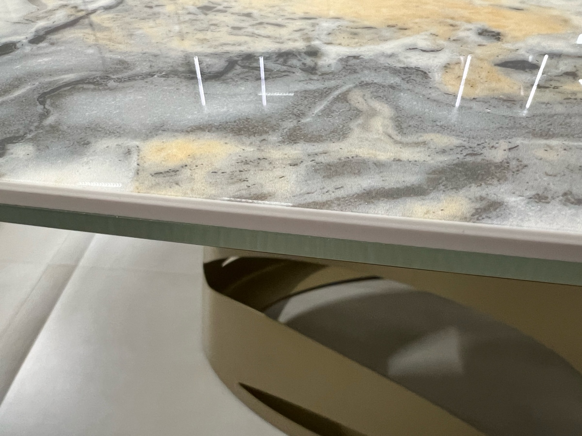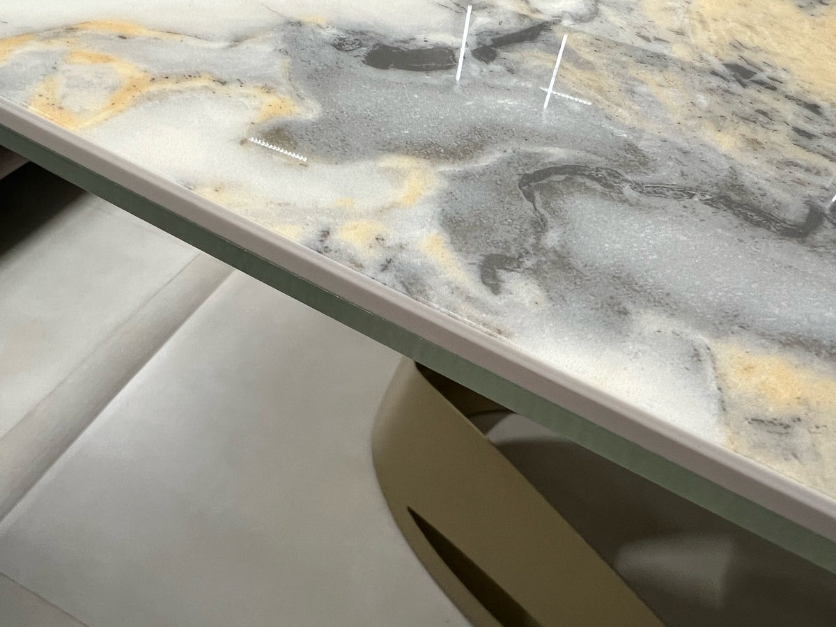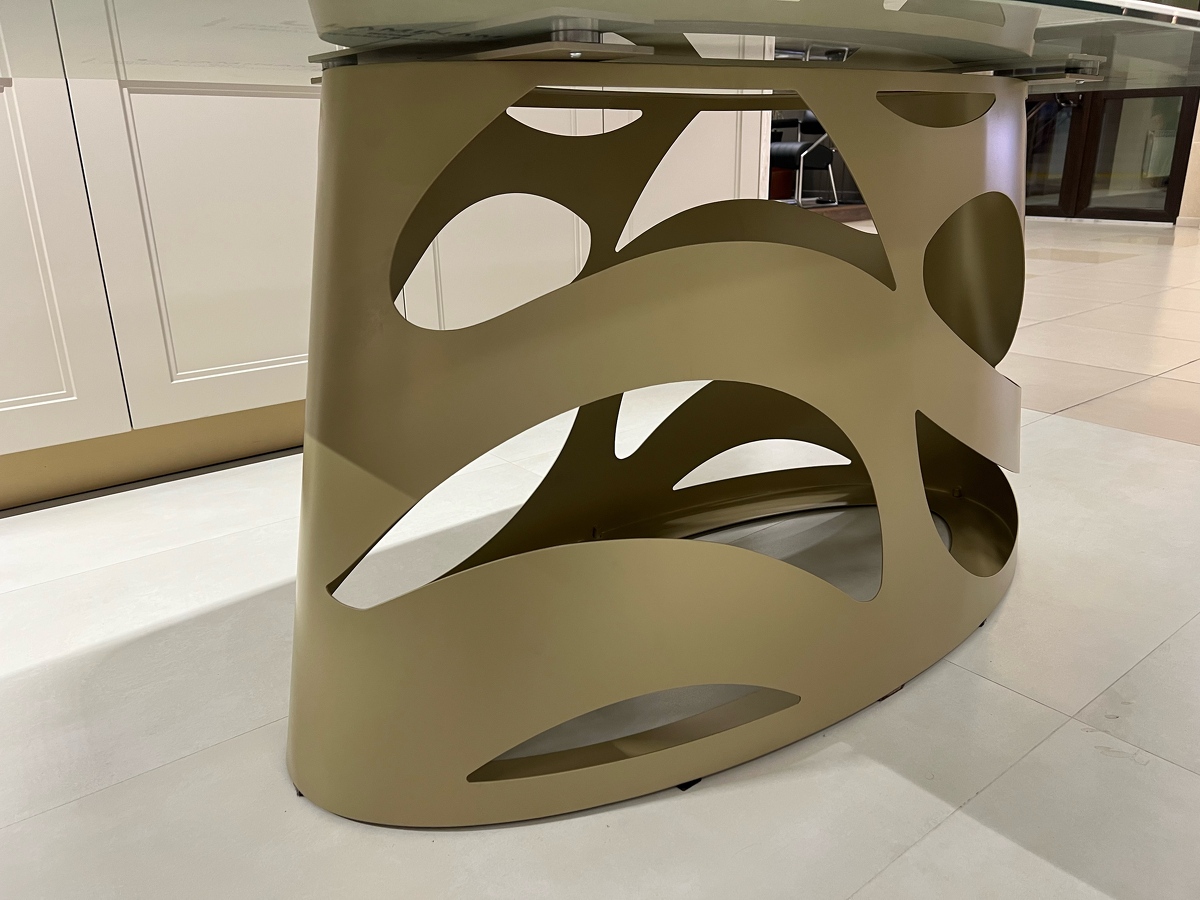 Столешница изготовлена из керамогранита, усиленного стеклом. Столешница имеет эргономичную форму в виде бочки.