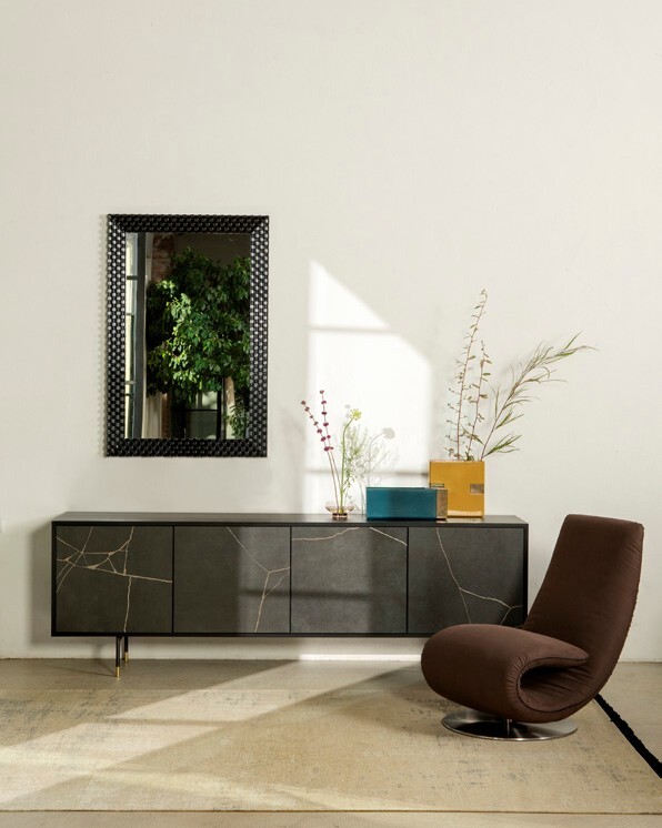 Четырехдверная тумба Kintsugi, отделана керамическими плитами, воспроизводящими технику древнего японского искусства кинцуги. Внутренние стеклянные полки, каркас из черного ясеня и легкое металлическое основание акцентируют внимание на характерных драгоценных прожилках.
