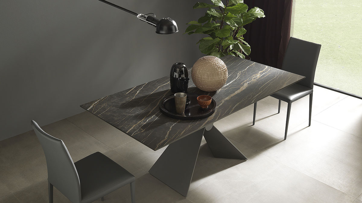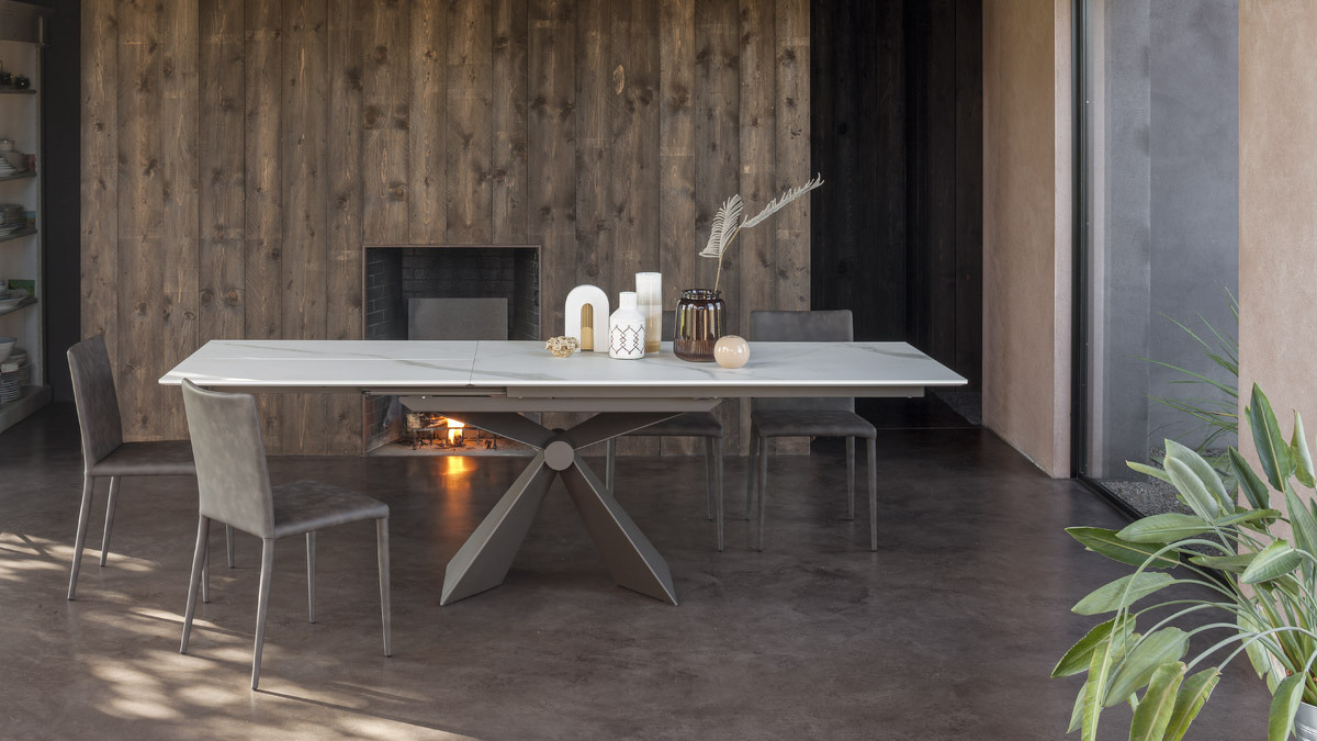 Центральный, связующий элемент основания характеризует весь дизайн стола SINTESI, обеспечивая ему стабильность во время раскладывания. Вставка хранится внутри стола в сложенном виде и всегда готова увеличить площадь рабочей поверхности стола.