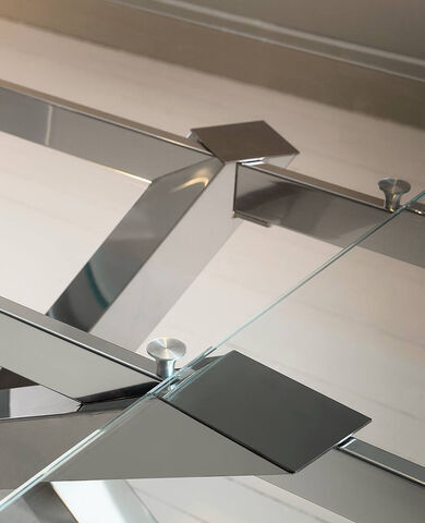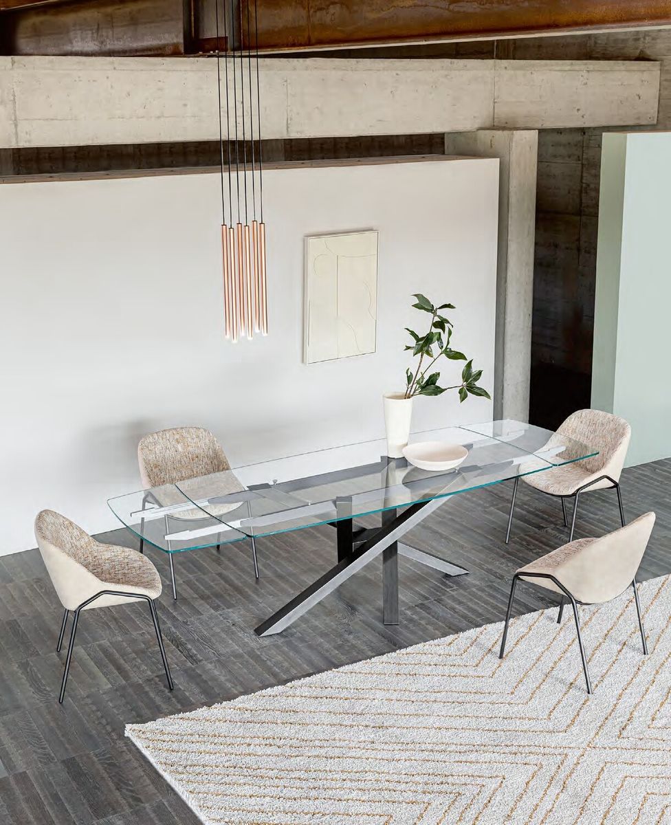 Стол на металлическом основании из перекрещенных между собой ног в асимметричной форме вокруг центрального элемента. Особенно эффектно смотрится стол на основании из зеркальной нержавеющей стали. Столешница изготовлена из экстра прозрачного стекла толщиной 12/15 мм. На фото представлена комплектация, не имеющая аналогов у других производителей: стол с прозрачной раскладной столешницей бочкообразной формы. Столешница может быть также дымчатого цвета fume. Варианты отделки основания-окрашенный металл в различных цветах или отделка натуральным шпоном дерева. Размер L180/260 P90 H77.